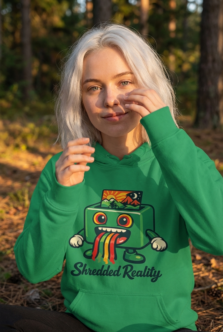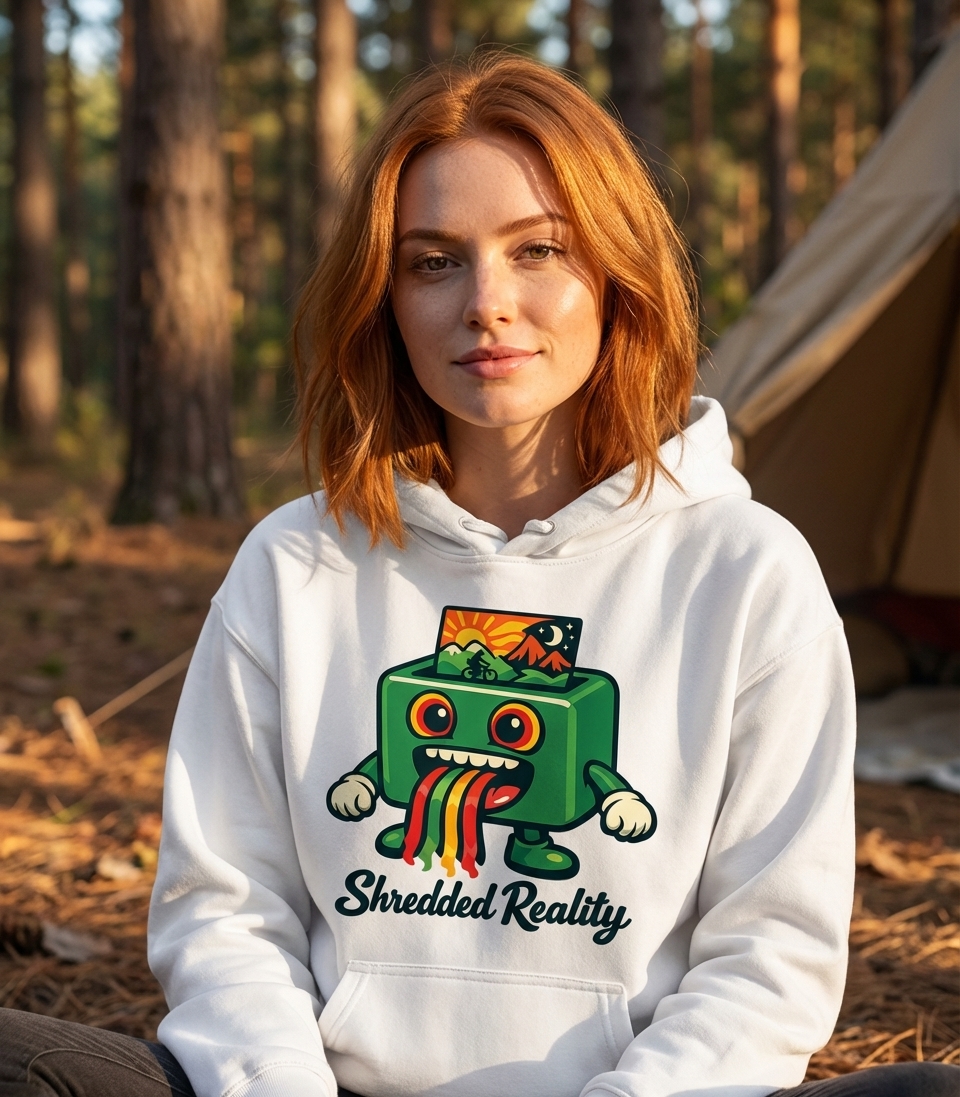 The Shredded Reality design captures the mindset of adventurous cyclists who explore challenging trails, embrace vibrant experiences, and see the world uniquely.