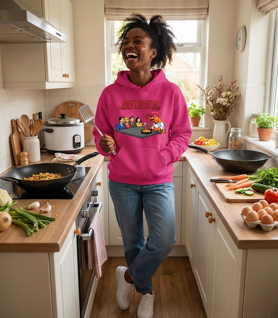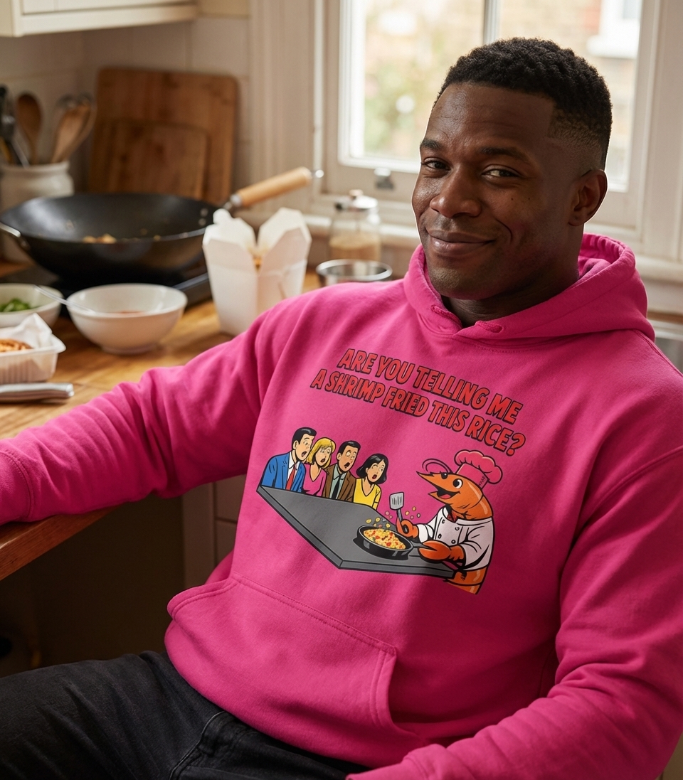 The "shrimp fried this rice" phrase captures the lifestyle of passionate foodies who enjoy clever culinary humor, surprising their friends, and sharing a good laugh over their favorite dishes.