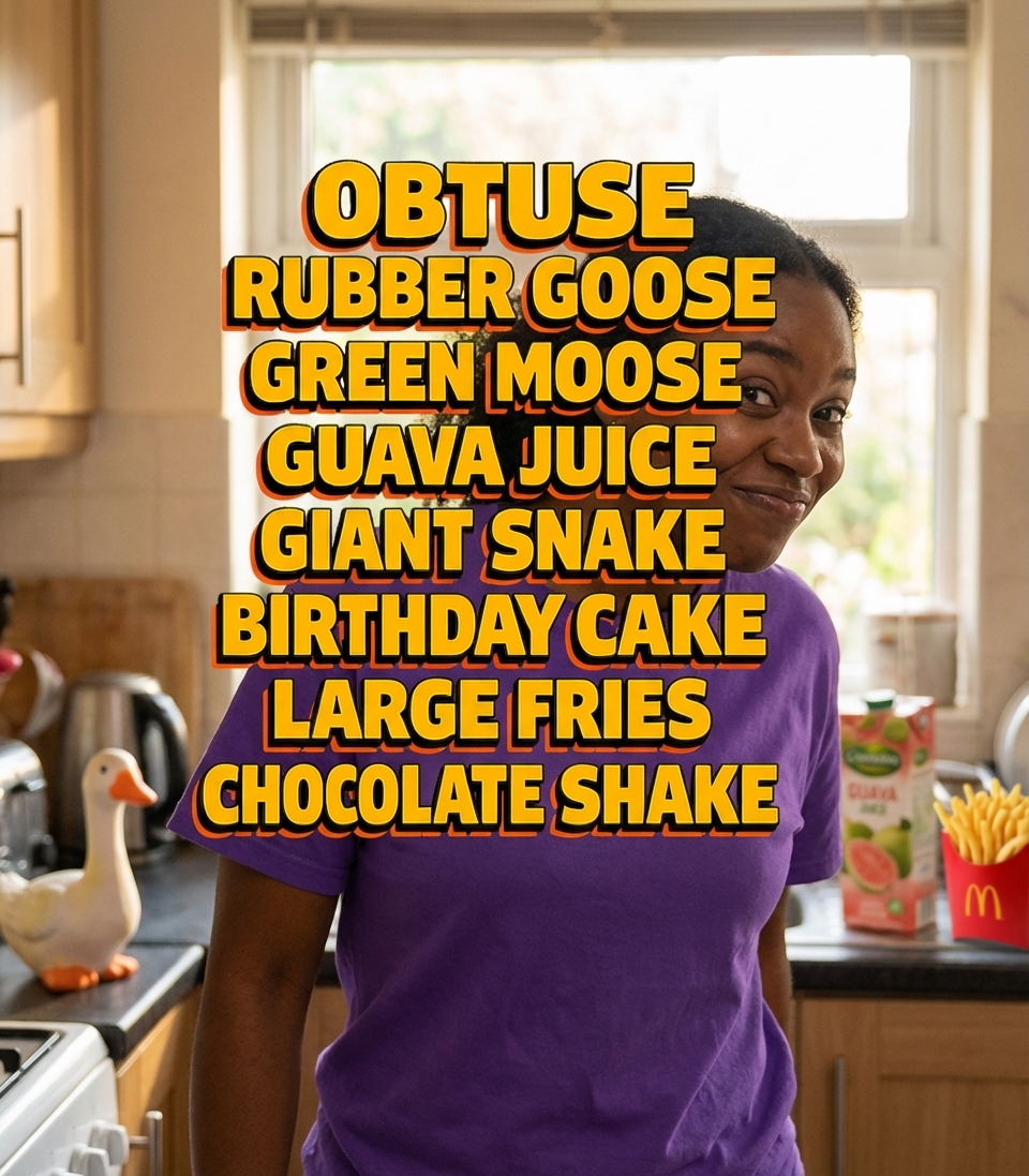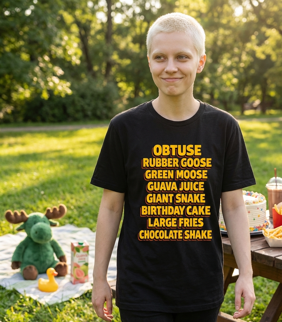 The core of this design is the clever use of wordplay and phonetic similarities, interspersed with intentional disruptions. Phrases like 'Obtuse' and 'Rubber Goose' establish a clear rhyming scheme, which is then subverted or changed by lines such as 'Giant Snake' leading into 'Birthday Cake'.