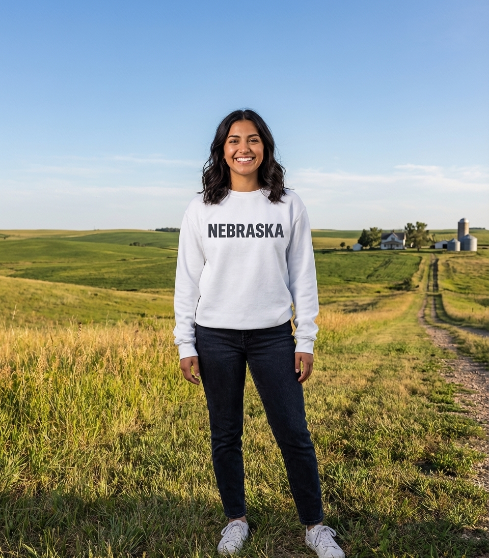 This design offers a simple, direct statement showcasing the state name "NEBRASKA." It serves as a bold declaration of local pride. The minimalist aesthetic ensures versatility, making it a timeless piece of apparel.