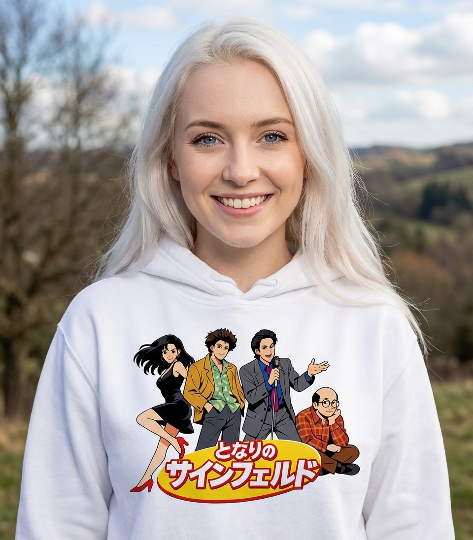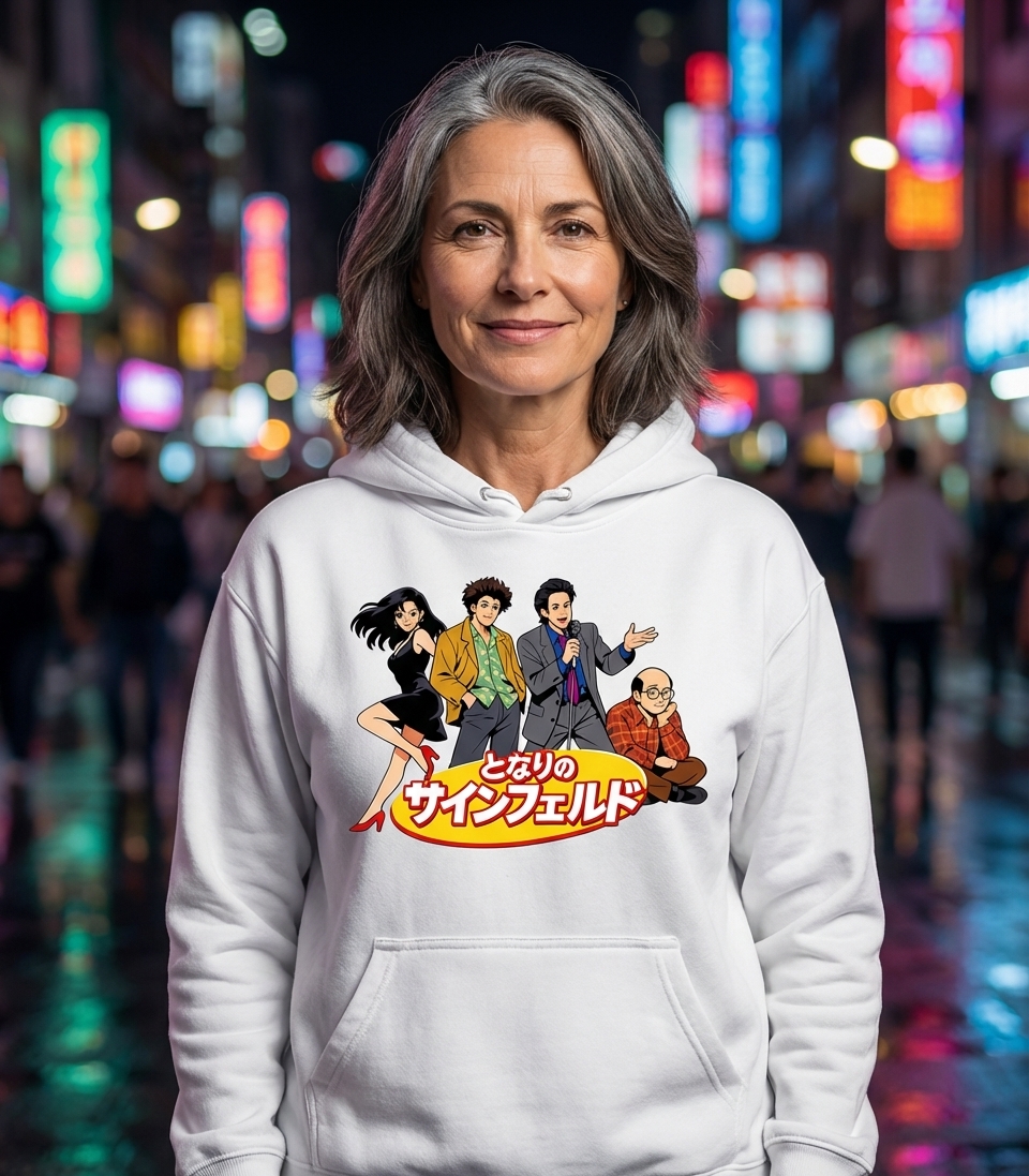 This 'My Neighbor Seinfeld' graphic captures the lifestyle of fans who love iconic 90s sitcoms, Japanese anime, and unique pop culture mashups.