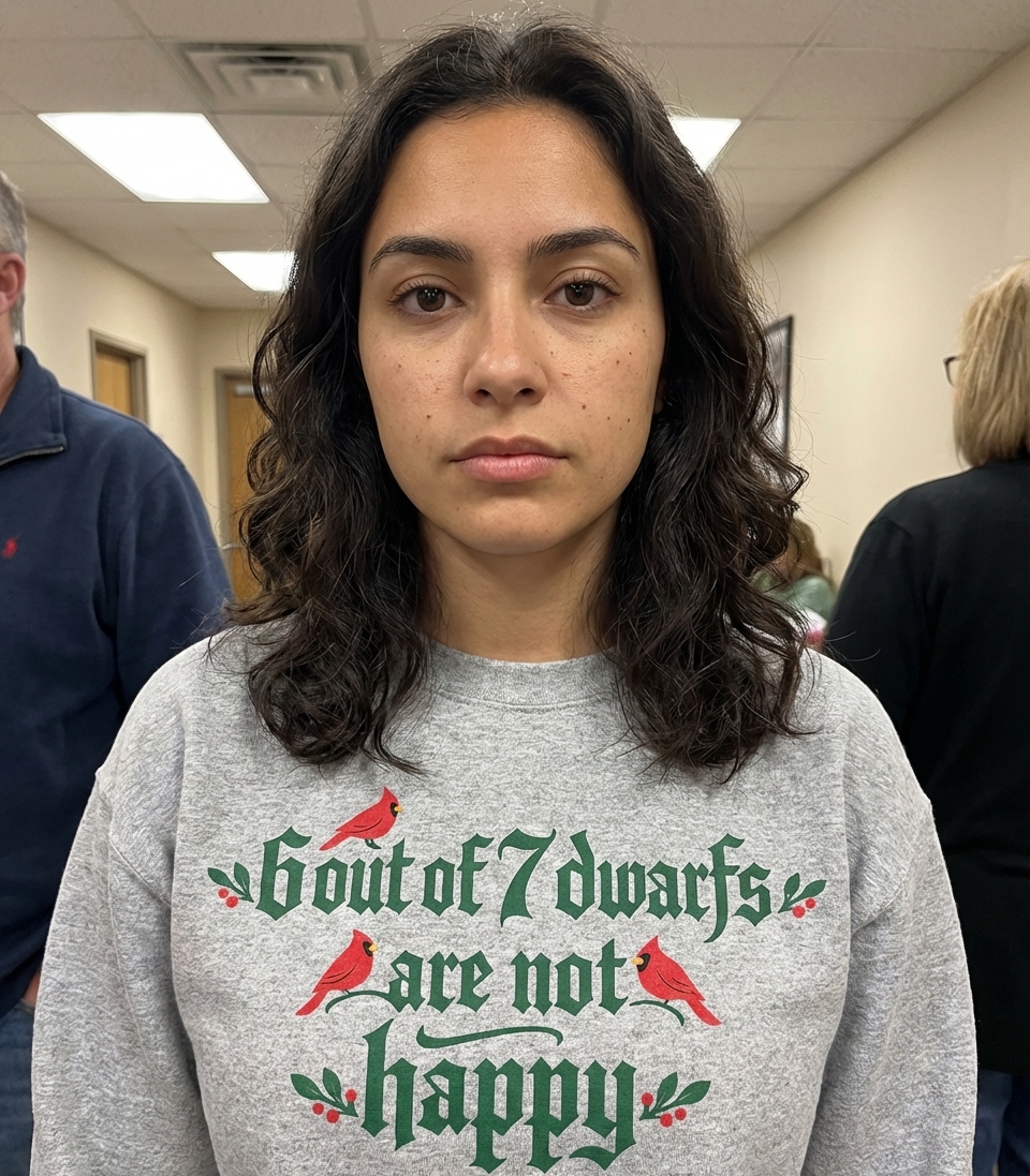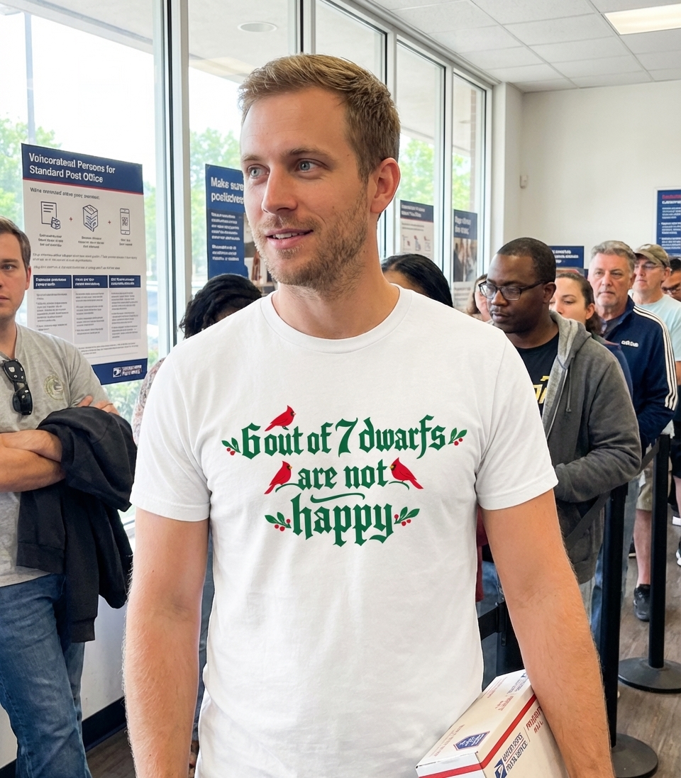 This graphic tee features a clever, humorous twist on a classic fairytale concept. Decorated with festive cardinal birds and holly berries, the design offers a unique blend of seasonal cheer and dry wit.