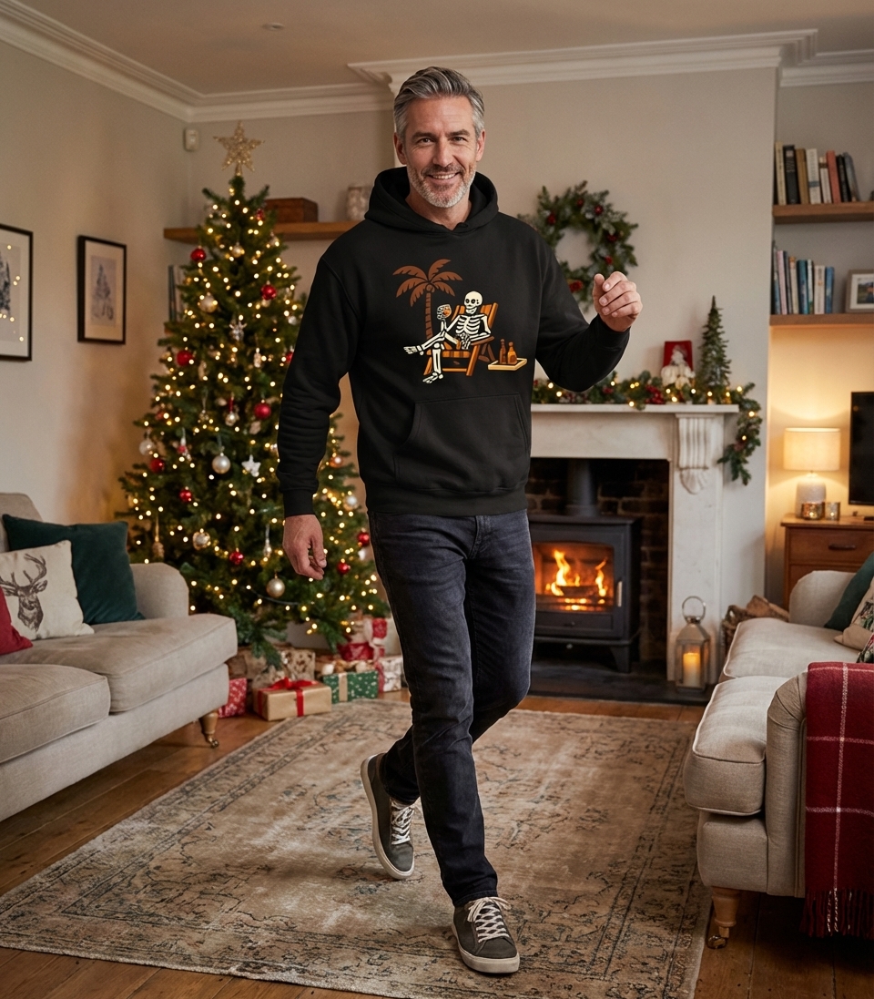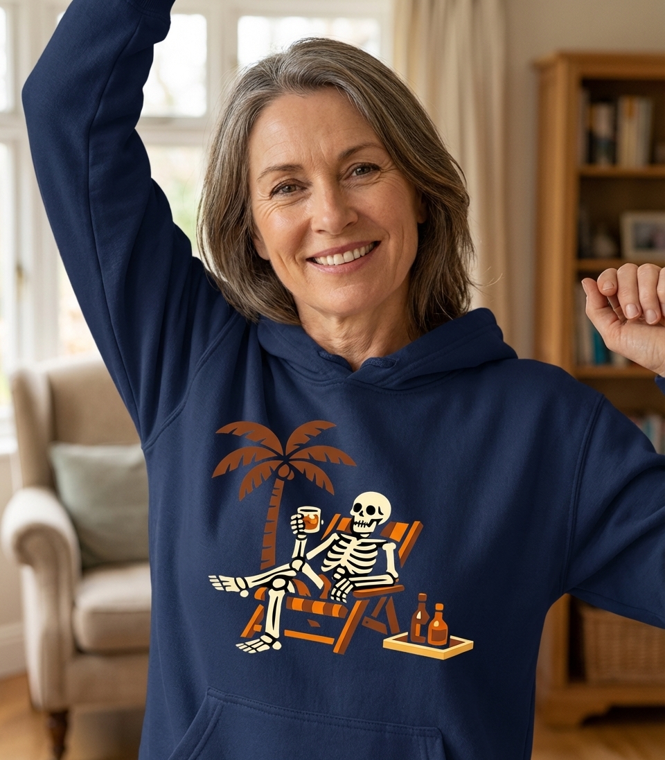 This unique graphic features a relaxed skeleton lounging comfortably in a beach chair under the shade of a palm tree. With a refreshing drink in hand and two bottles on a nearby tray, the scene evokes a perpetual holiday atmosphere.