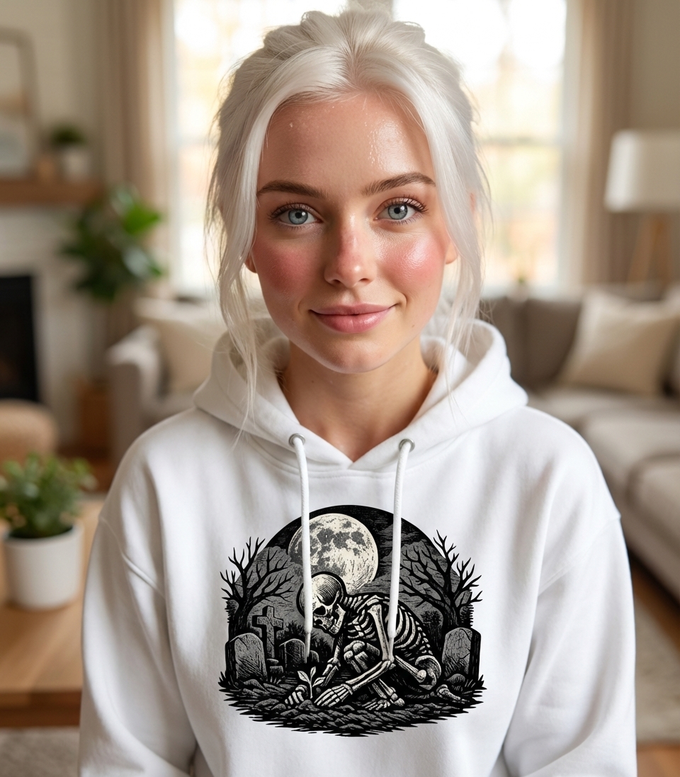 A striking black and white illustration depicts a skeletal figure gently tending a vibrant new sprout in a moonlit graveyard. This artwork masterfully blends themes of mortality with the powerful symbol of new beginnings, creating a serene yet thought-provoking scene.