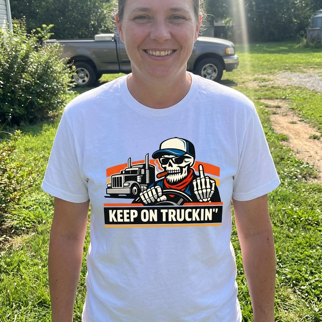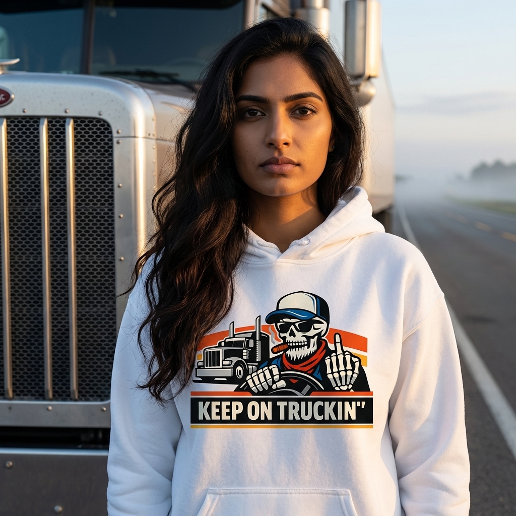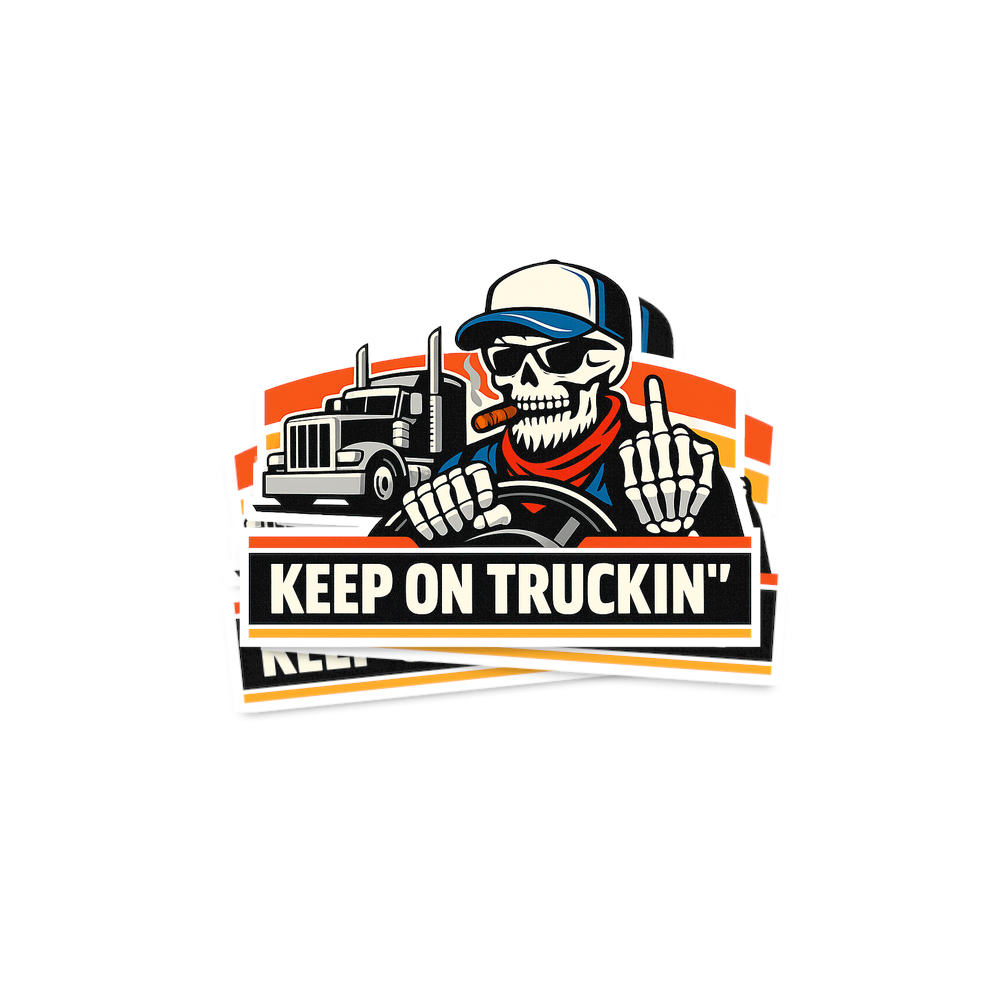 The 'Keep On Truckin'' phrase captures the lifestyle of dedicated long-haul truckers who spend their days on the open road, delivering goods, and embracing a tough, independent spirit.
