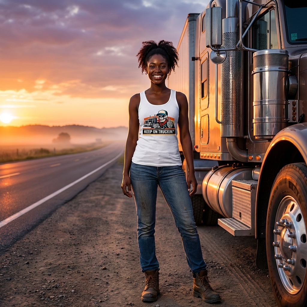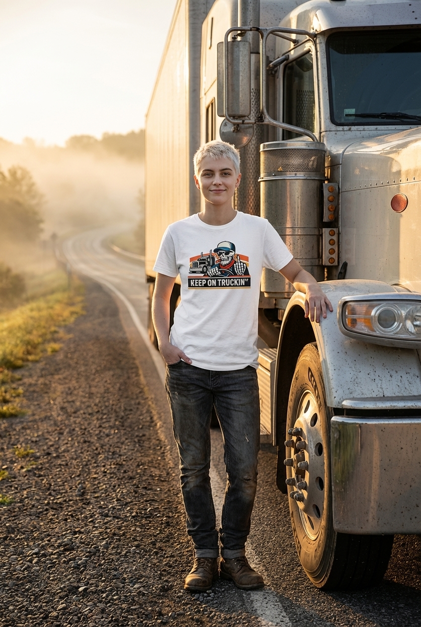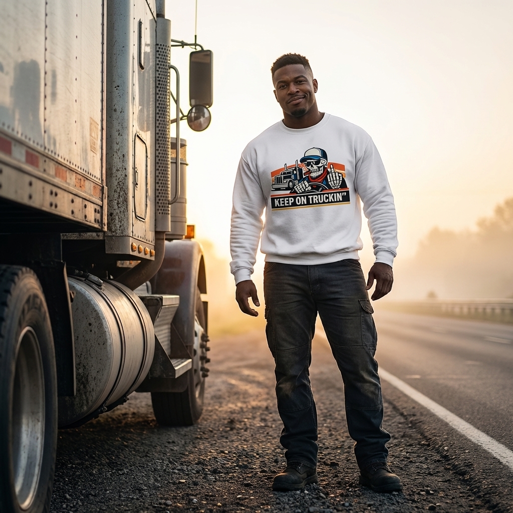The 'Keep On Truckin'' phrase captures the lifestyle of dedicated long-haul truckers who spend their days on the open road, delivering goods, and embracing a tough, independent spirit.