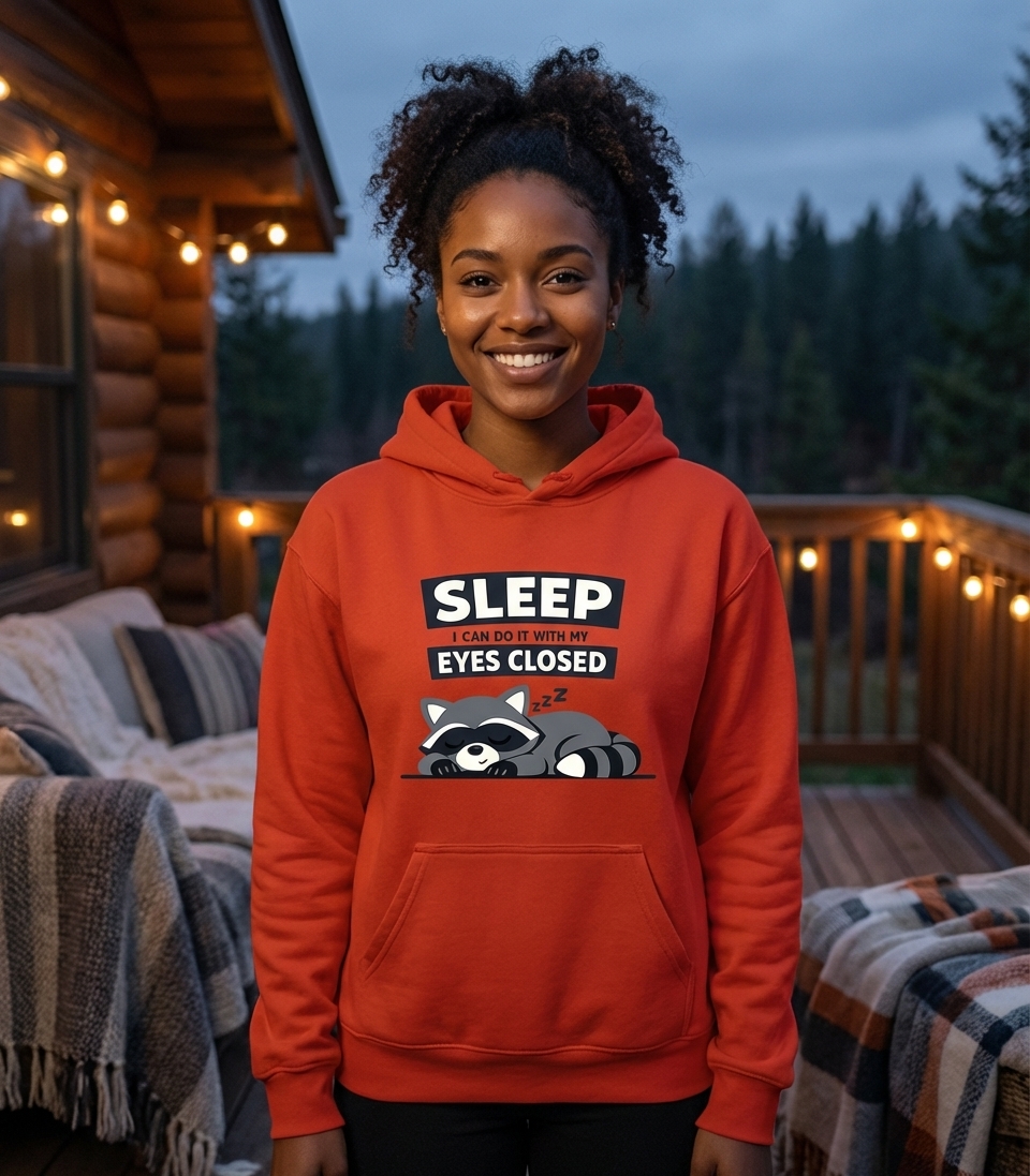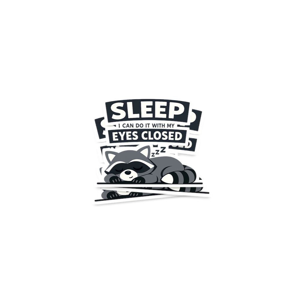 This charming graphic features a sleepy cartoon raccoon peacefully napping on a solid black background. Above the adorable animal, the bold text "SLEEP" is highlighted, followed by the smaller phrase "I CAN DO IT WITH MY EYES CLOSED," making a clever and relatable statement about the ease of falling asleep.