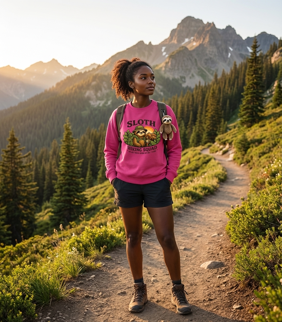 This unique t-shirt design features a cheerful sloth, fully equipped with a hiking hat, backpack, and walking stick, set against a backdrop of majestic mountains and a glowing sunset. Lush green foliage frames the scene, emphasizing the love for nature and the tranquility of outdoor adventures.