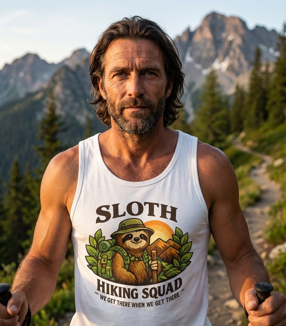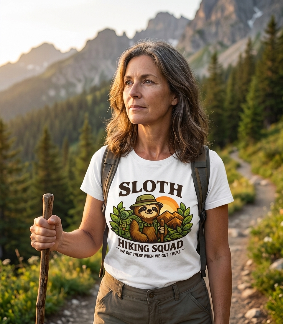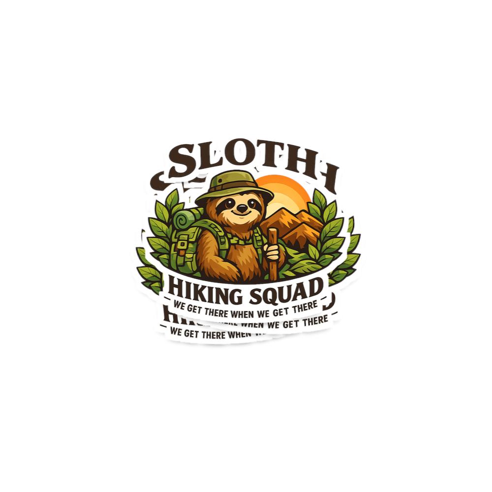 The phrase "Sloth Hiking Squad" with the playful motto "We Get There When We Get There" embodies a lighthearted approach to hiking and outdoor exploration. It celebrates the joy of the journey over the speed of arrival, appealing to those who prefer a relaxed pace and savor every moment of their adventure.