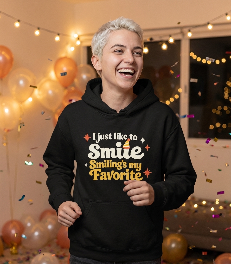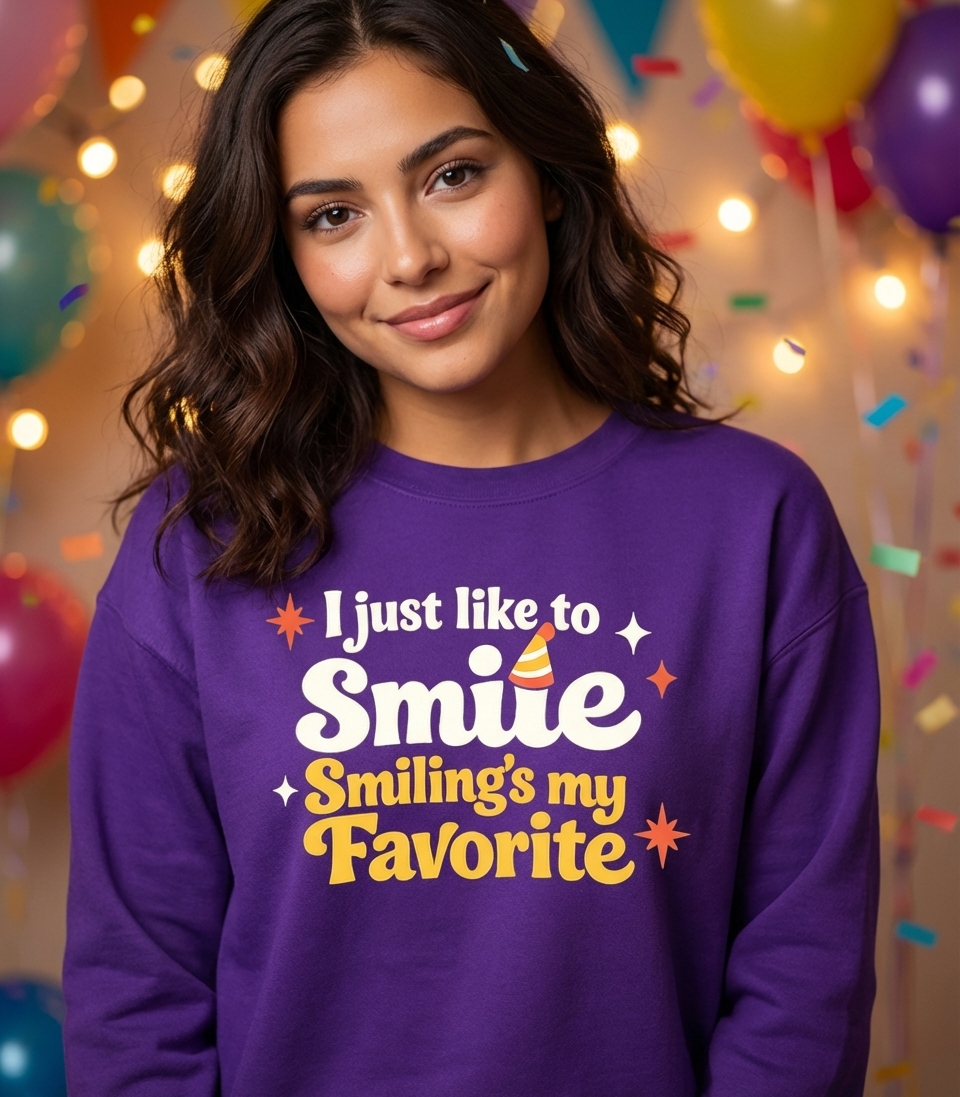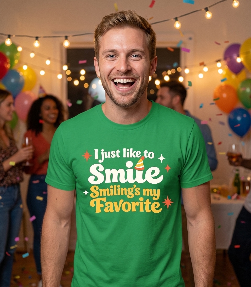 This vibrant graphic tee features a cheerful declaration: "I just like to Smile, Smiling's my Favorite." The design combines playful typography with sparkling elements and a celebratory party hat, conveying a message of pure joy and optimism.