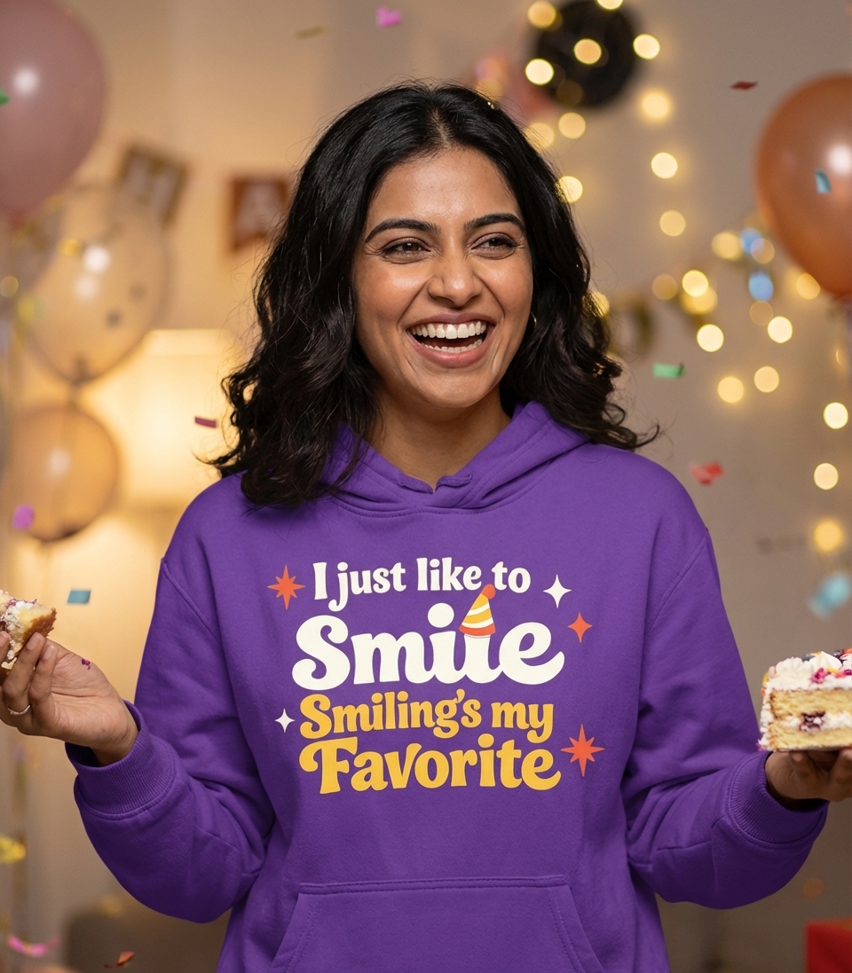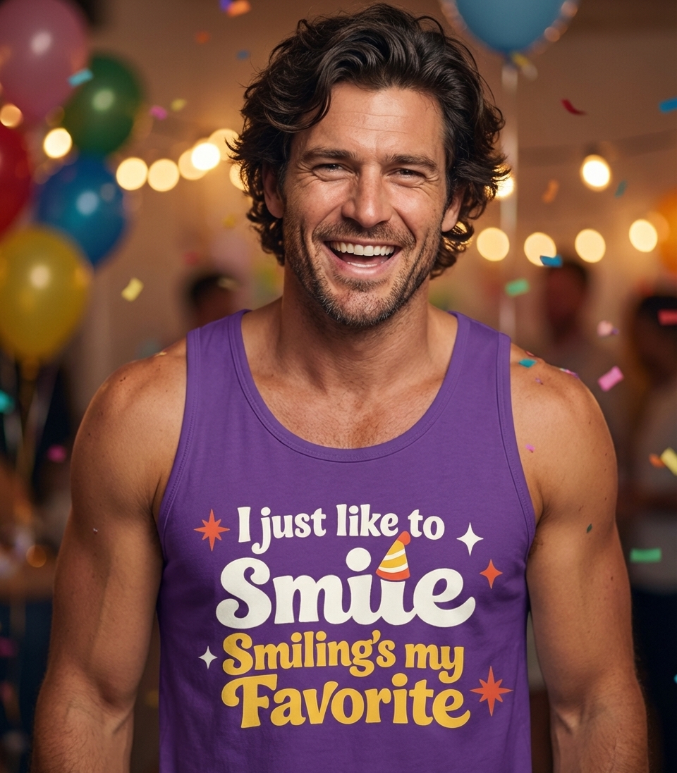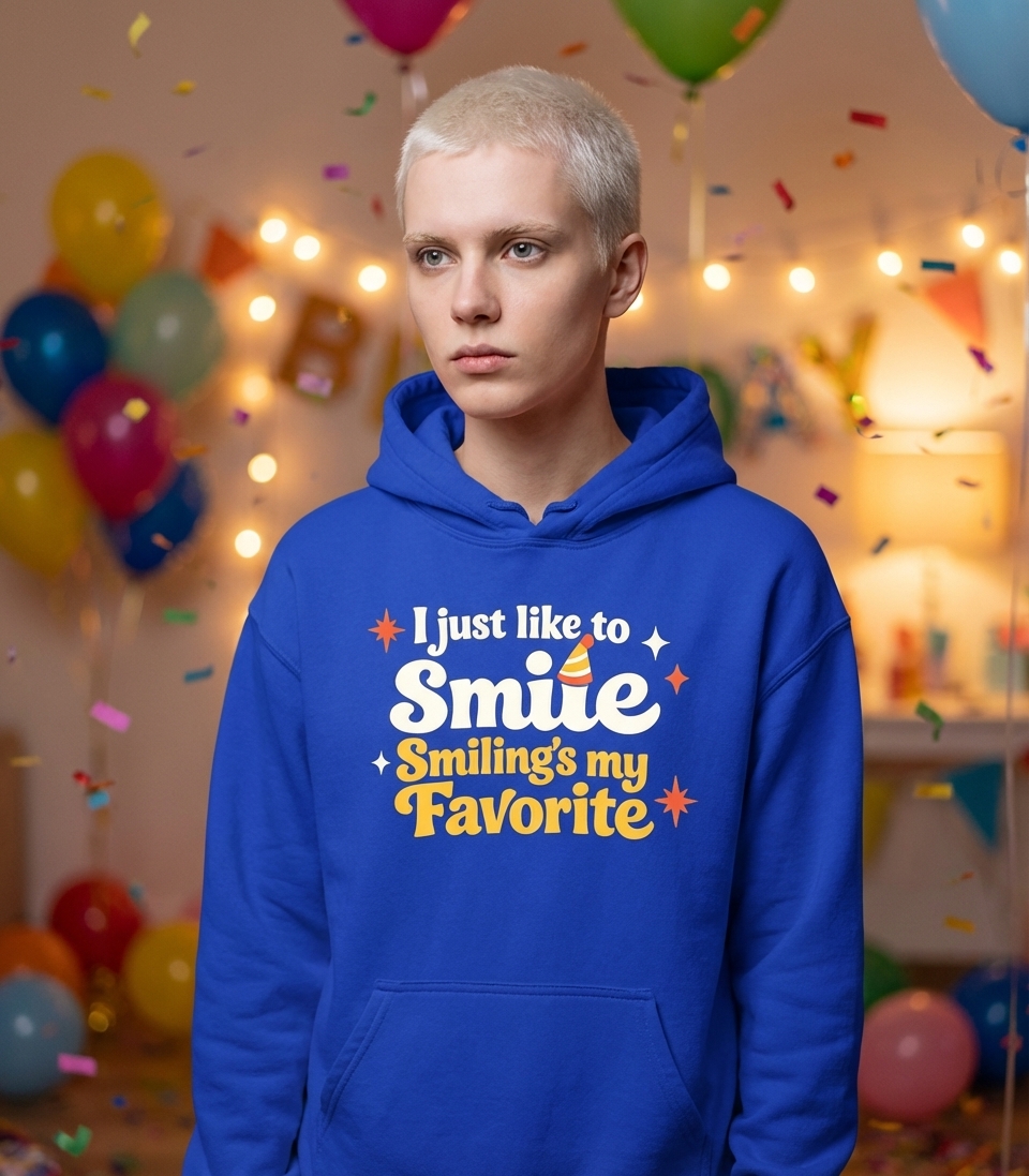 This vibrant graphic tee features a cheerful declaration: "I just like to Smile, Smiling's my Favorite." The design combines playful typography with sparkling elements and a celebratory party hat, conveying a message of pure joy and optimism.
