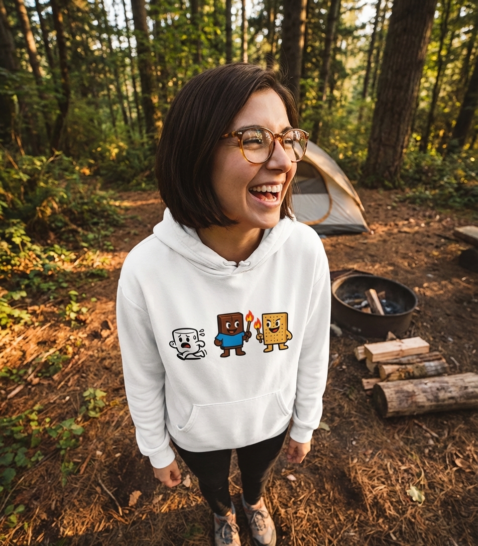 The "S'mores Hunting Party" design captures the playful spirit of outdoor enthusiasts who love roasting marshmallows, building campfires, and enjoying sweet treats under the stars.