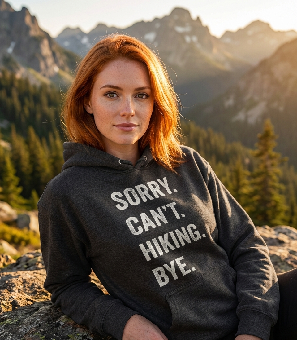The 'Sorry, Can't. Hiking. Bye.' phrase captures the lifestyle of passionate hikers who prioritize trails, embrace the outdoors, and politely decline other plans.