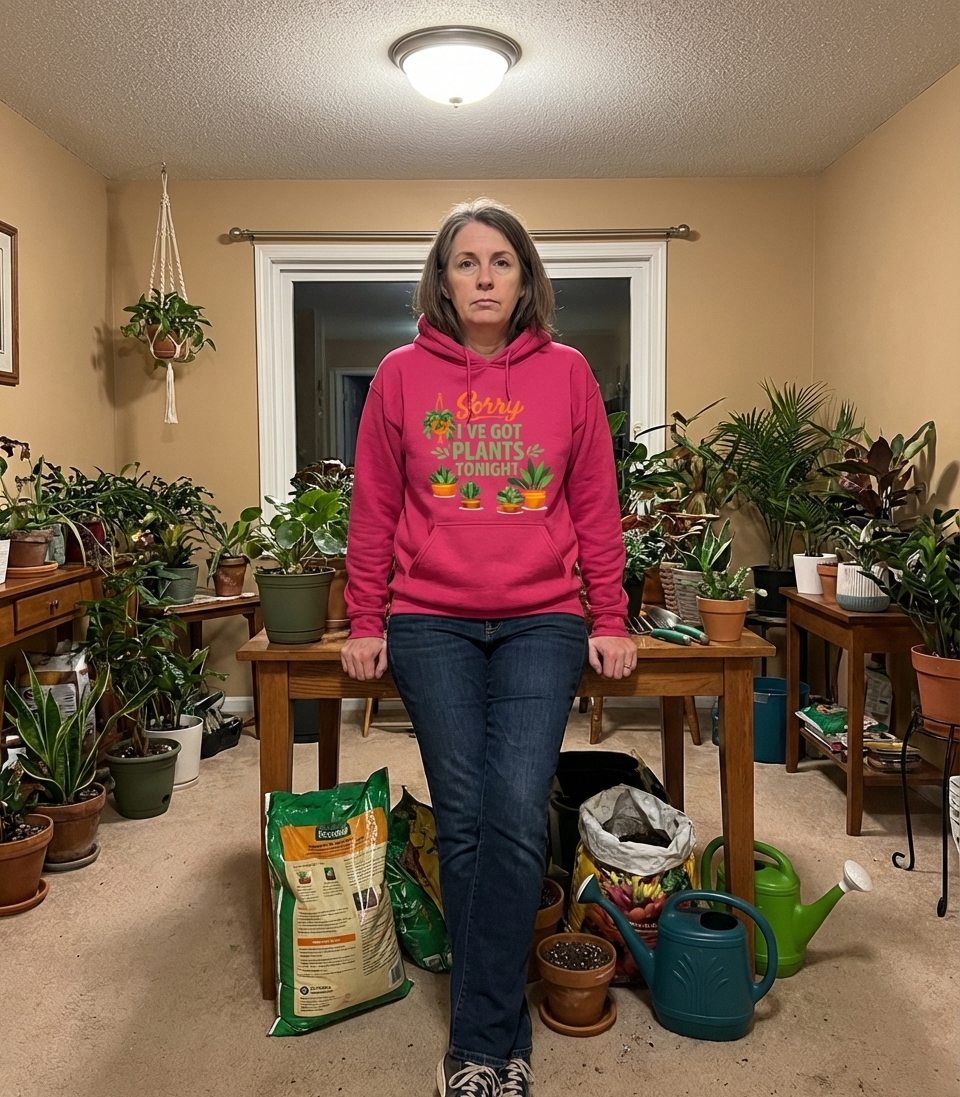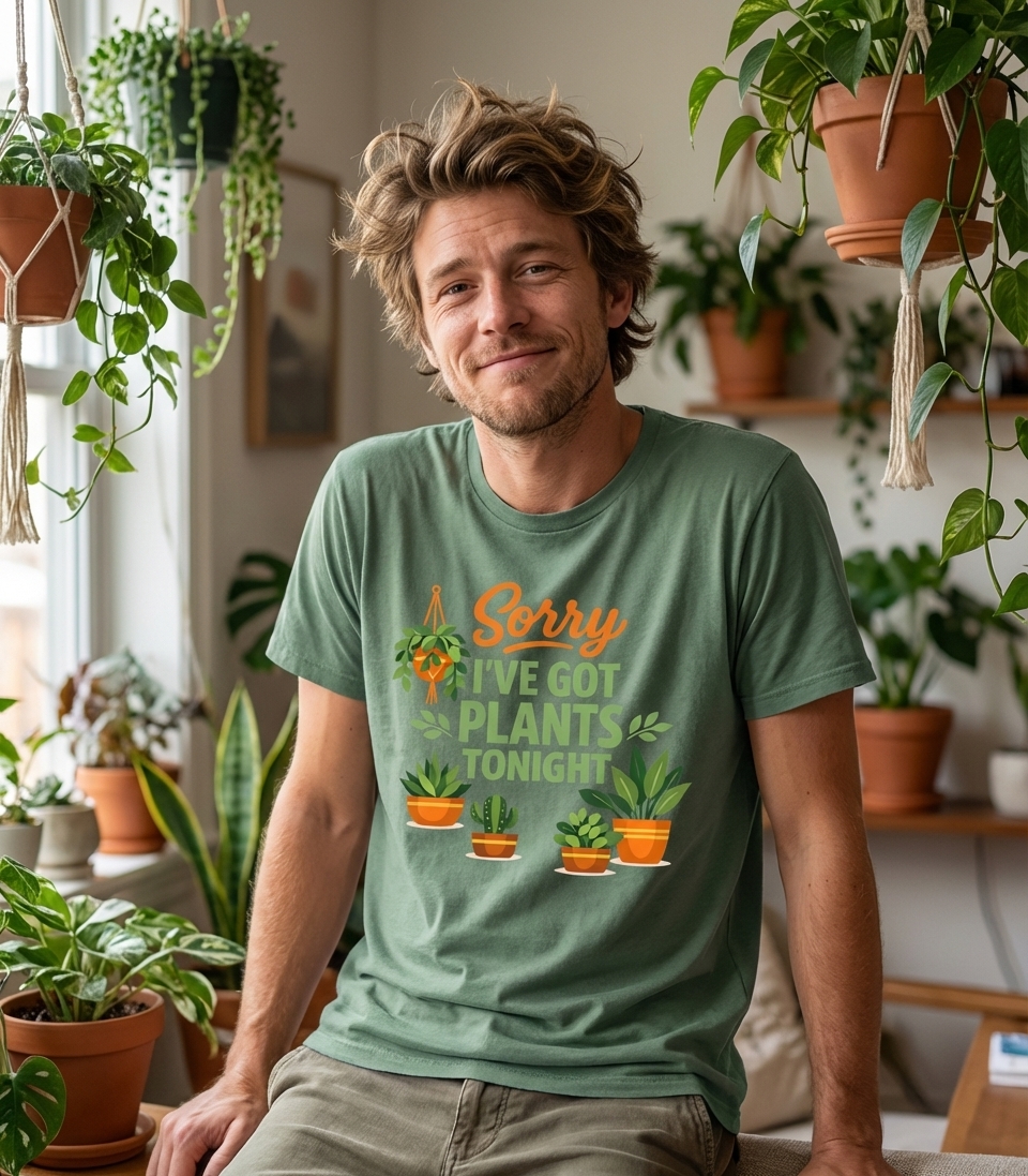 The 'Sorry I've Got Plants Tonight' phrase captures the lifestyle of dedicated plant parents who prefer nurturing their green family over social outings.