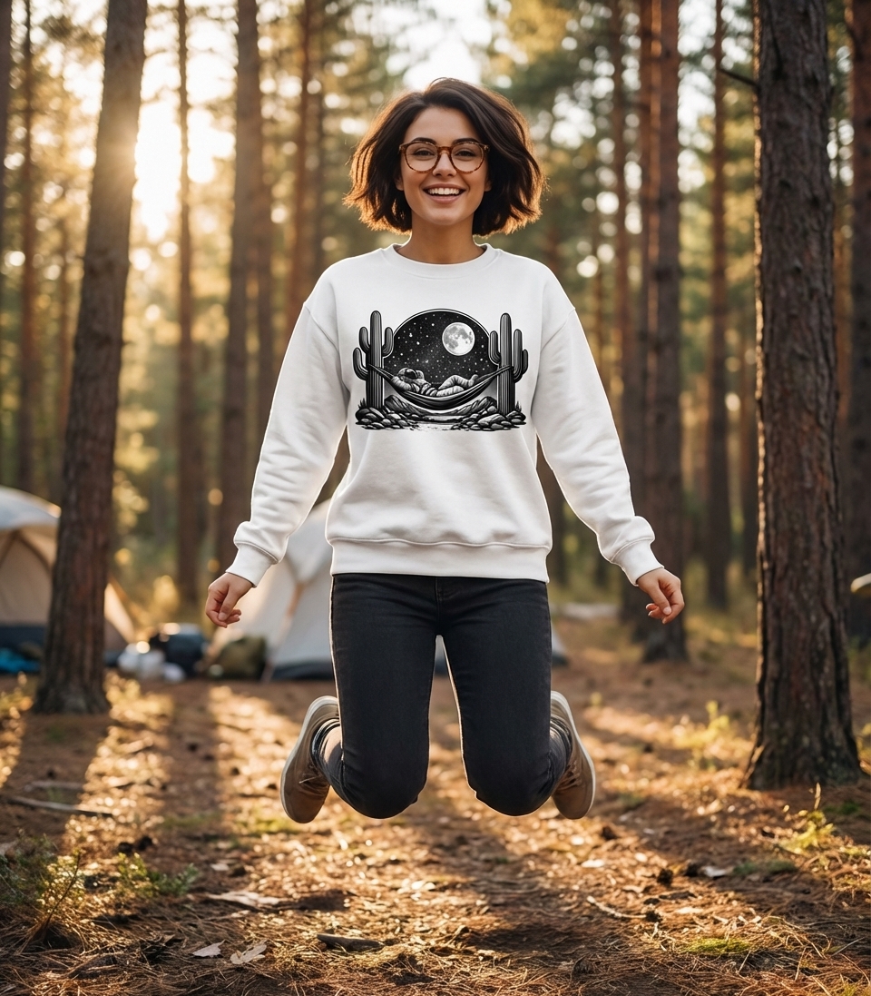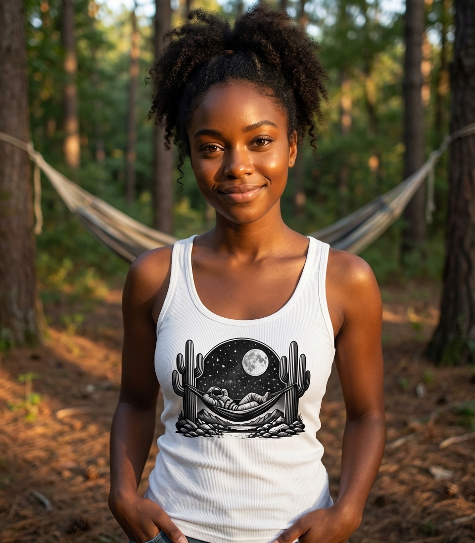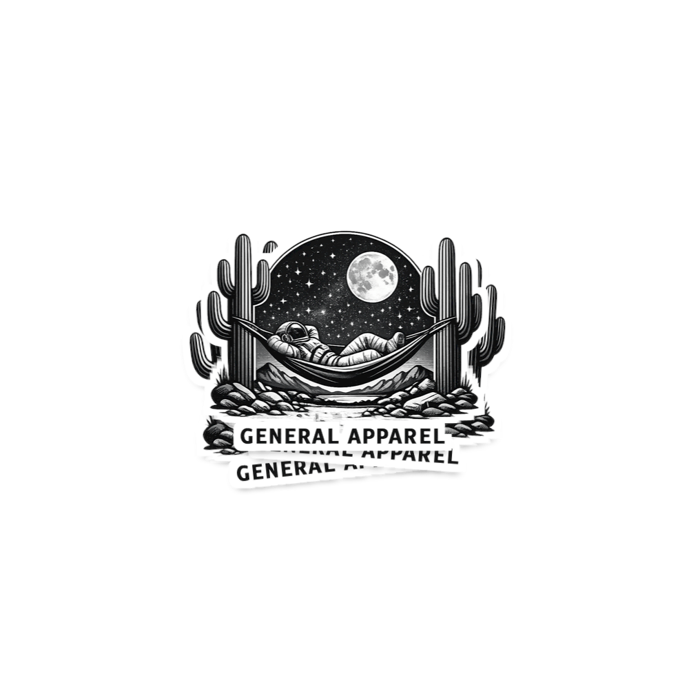 This captivating design features an astronaut leisurely lounging in a hammock, strung between two towering saguaro cacti. The scene unfolds under a breathtaking starry night sky, illuminated by a full moon, creating a unique blend of cosmic adventure and desert serenity.