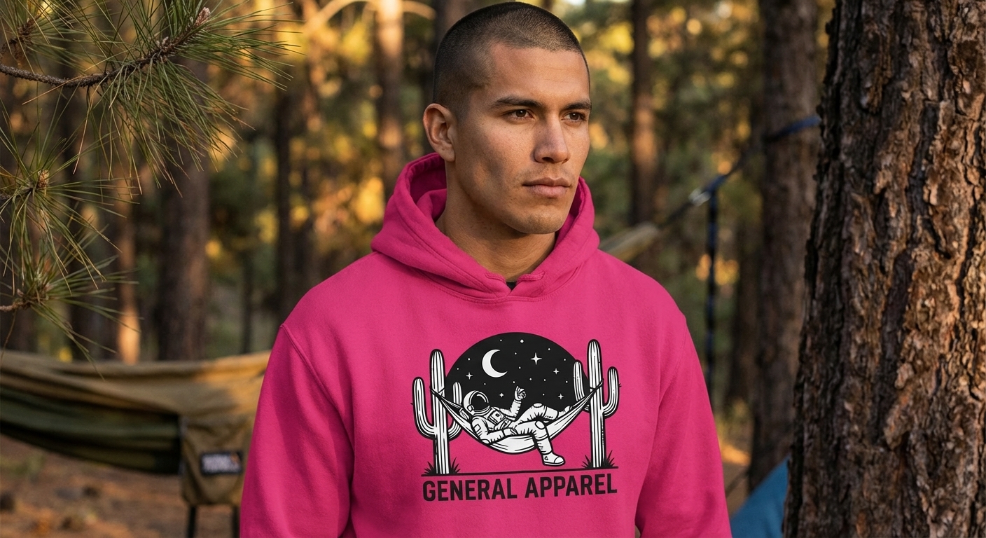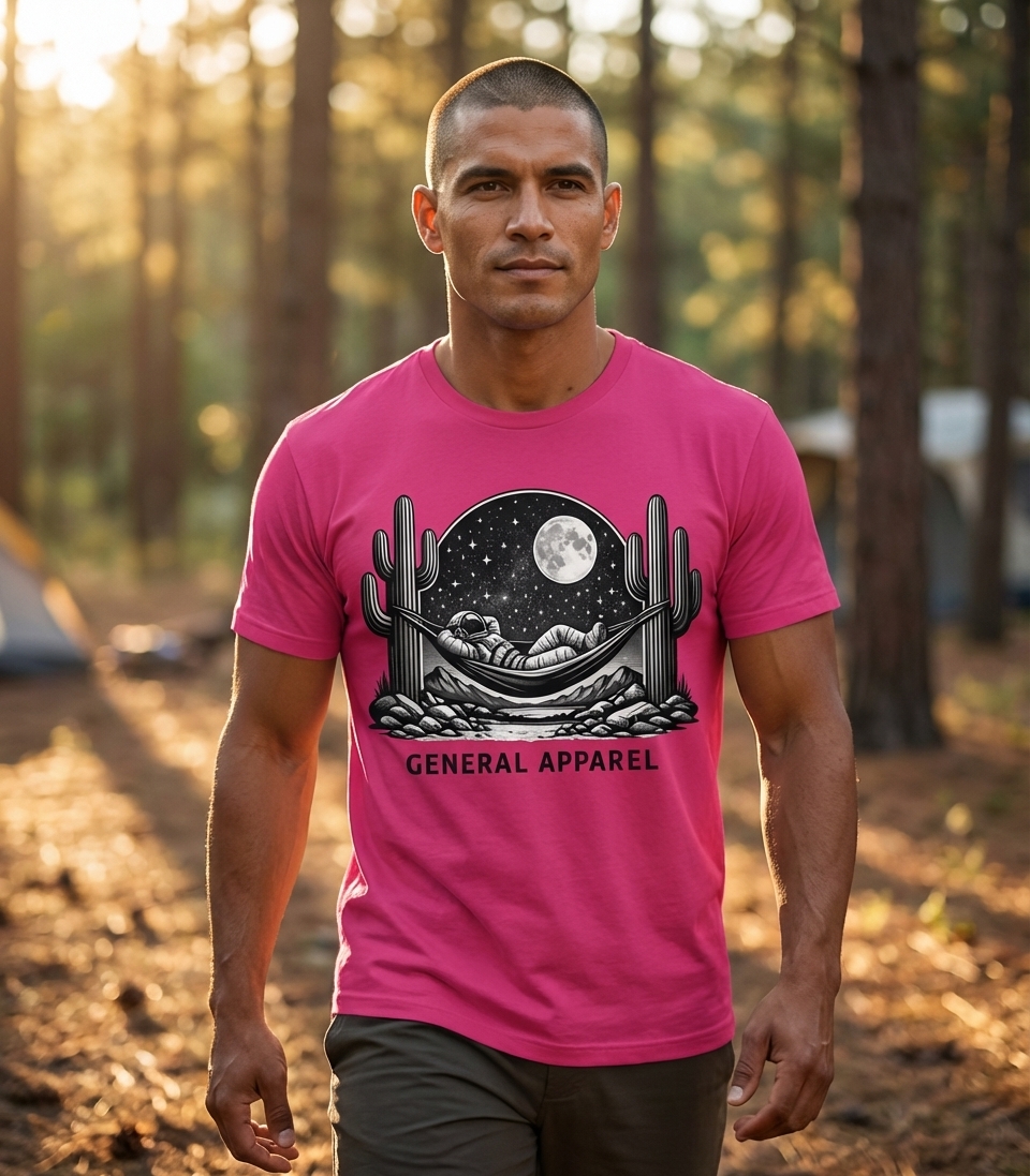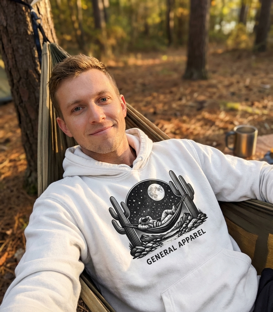 This captivating design features an astronaut leisurely lounging in a hammock, strung between two towering saguaro cacti. The scene unfolds under a breathtaking starry night sky, illuminated by a full moon, creating a unique blend of cosmic adventure and desert serenity.