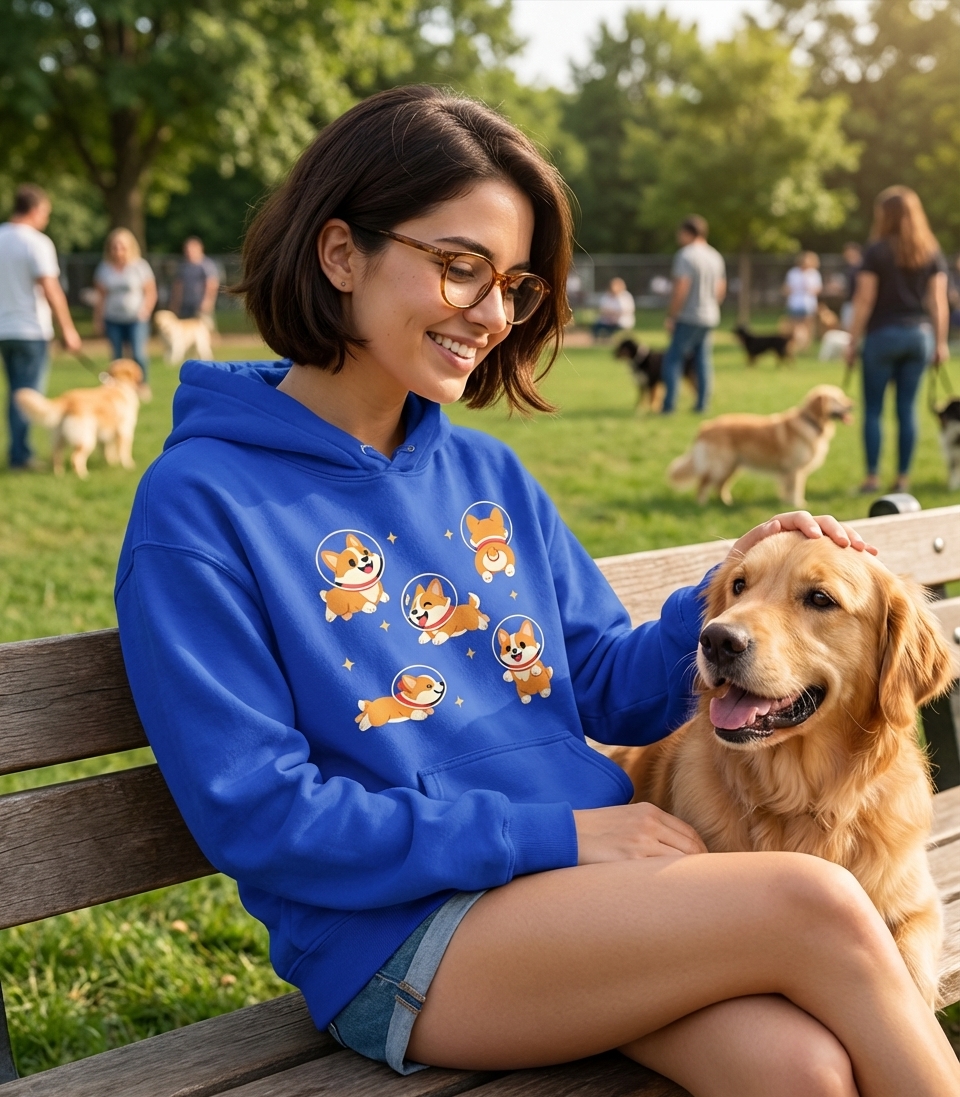 This design captures the playful spirit of corgi enthusiasts who adore space, dogs, and all things whimsical.