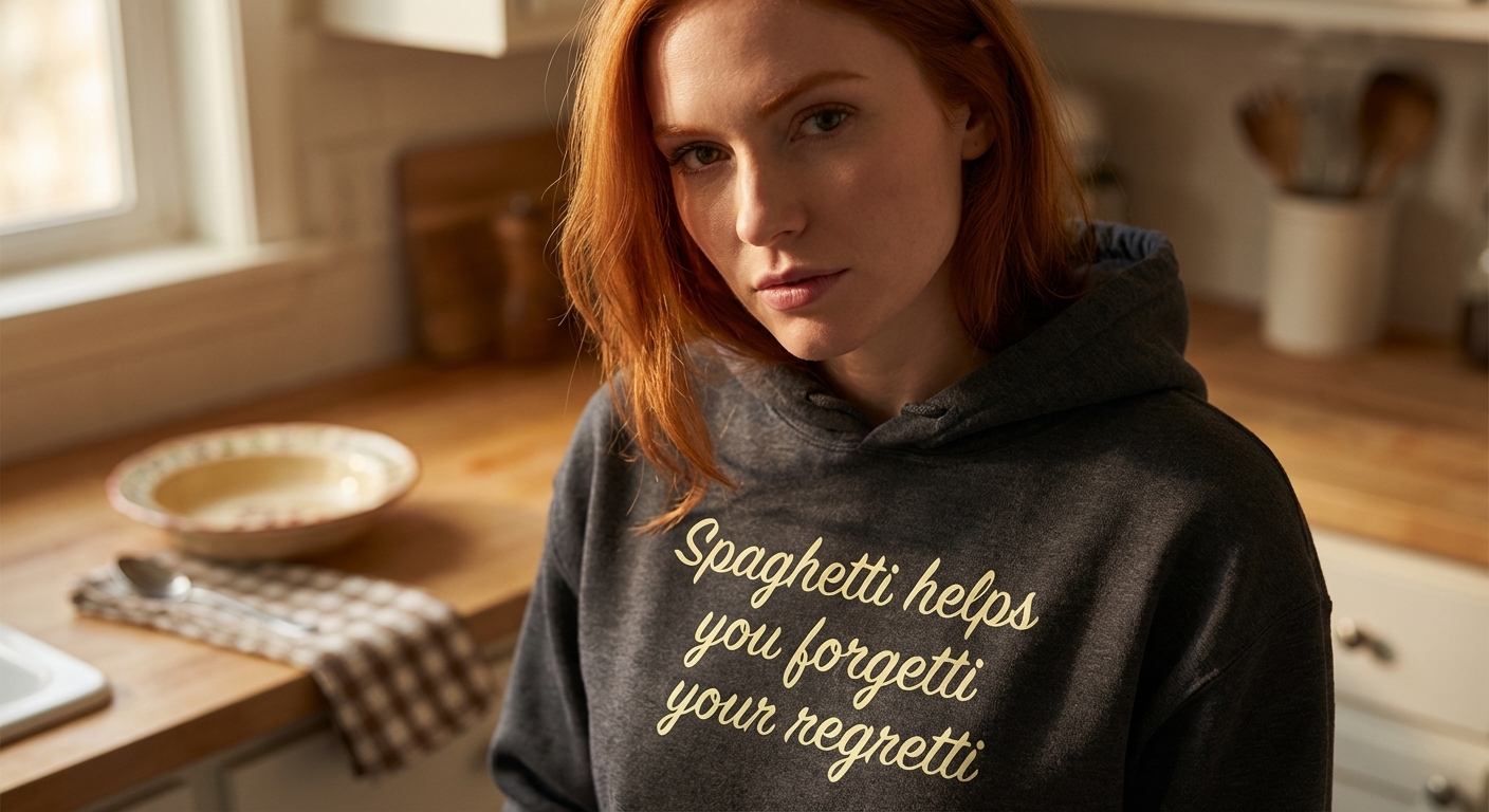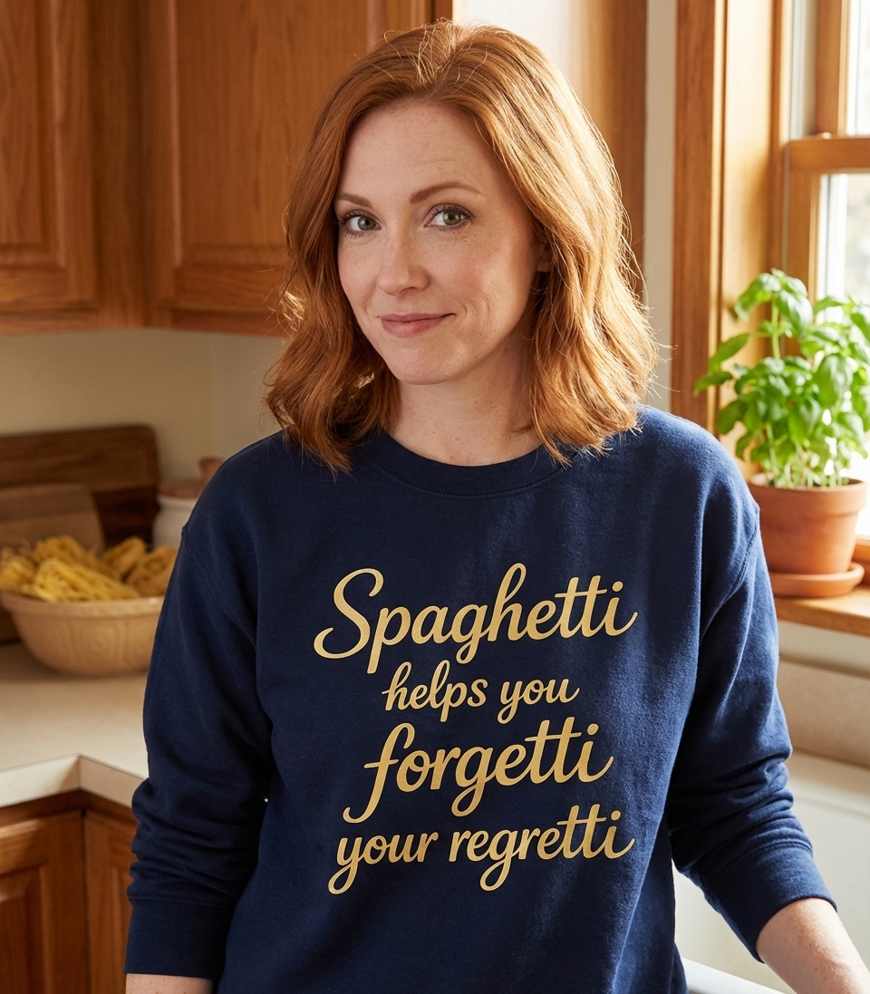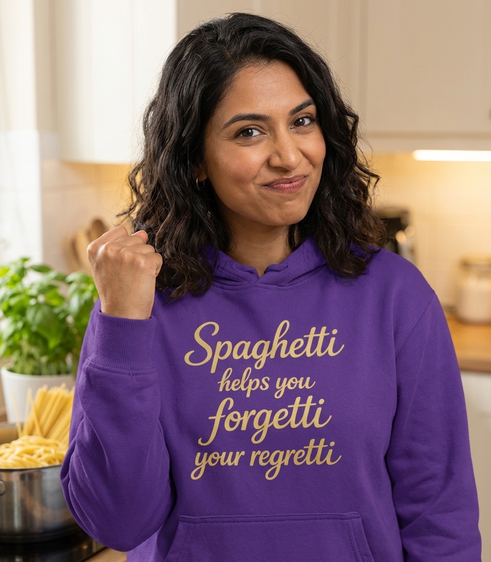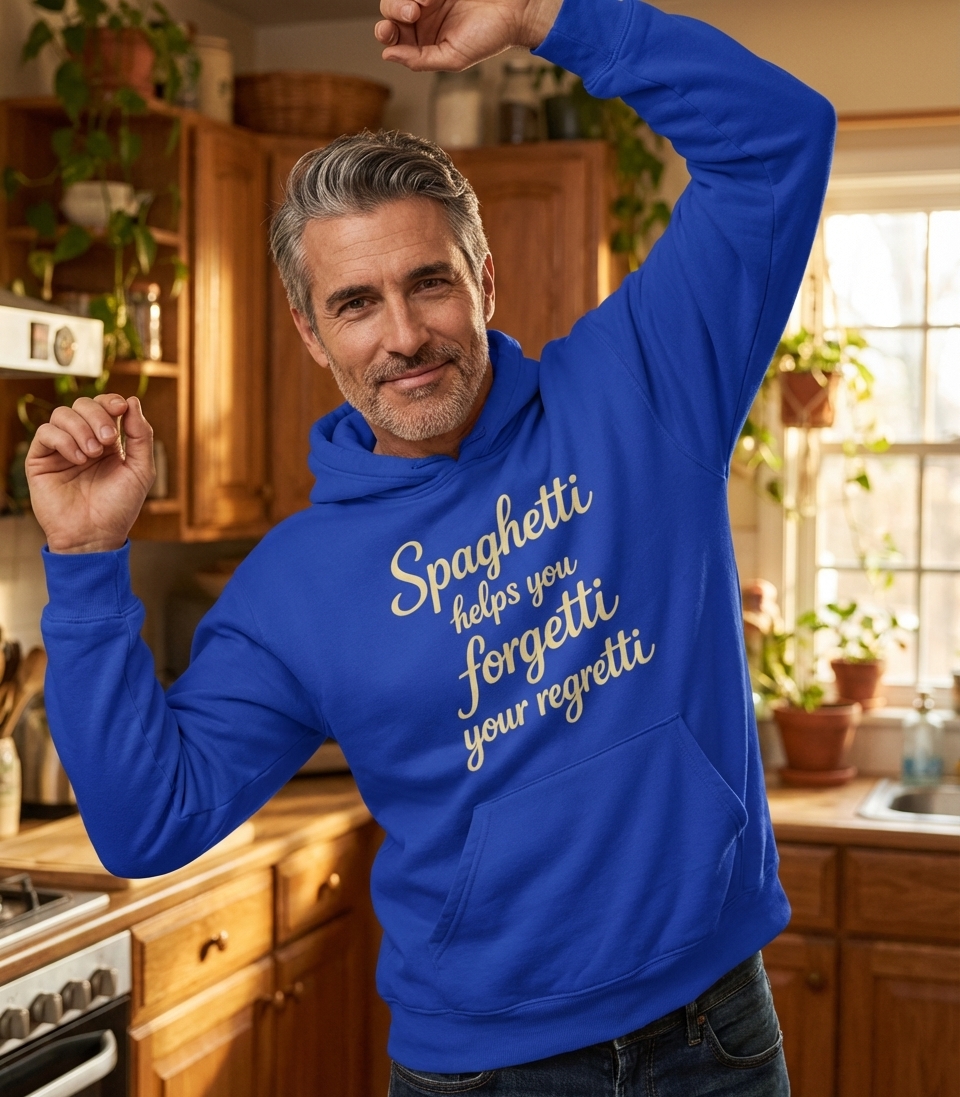 The phrase "Spaghetti helps you forgetti your regretti" is a clever rhyming pun that encapsulates the comforting power of food. It suggests that a delicious meal, specifically spaghetti, can help alleviate worries and regrets, offering a simple pleasure in challenging times.