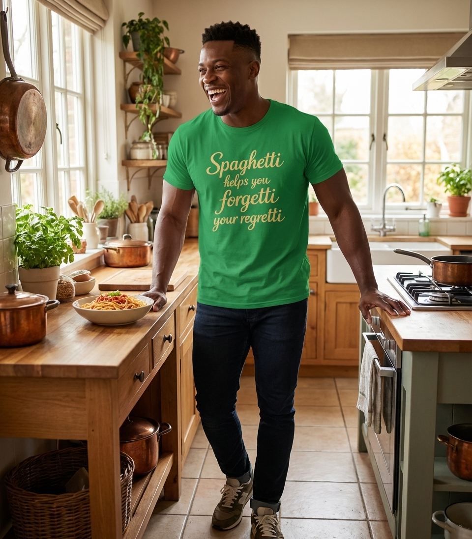 The 'Spaghetti Forgetti Regretti' phrase captures the lifestyle of pasta enthusiasts who love a good meal to unwind, find humor in everyday life, and appreciate a catchy food pun.