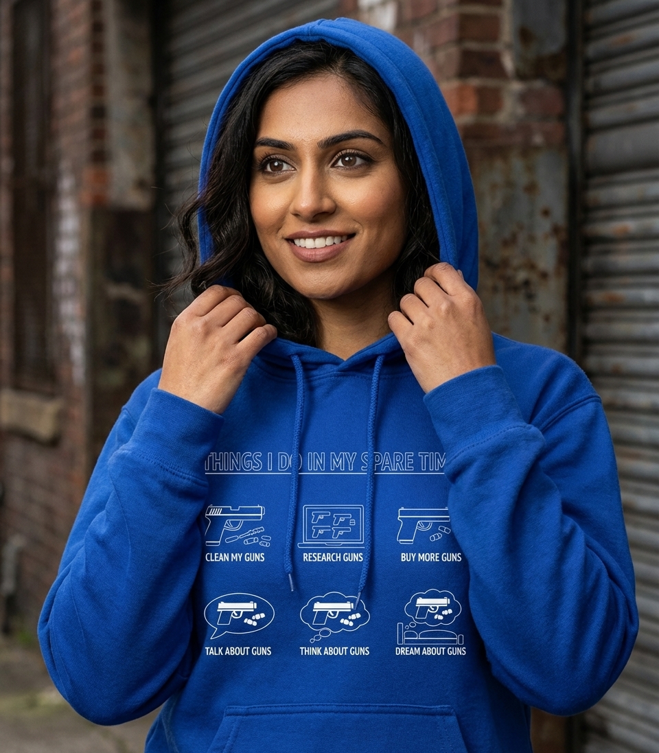 The phrase "Things I Do In My Spare Time" humorously highlights an overwhelming dedication to a specific hobby, in this case, firearms. It conveys a deep enthusiasm where guns are not just an interest, but a significant part of daily thought and action.