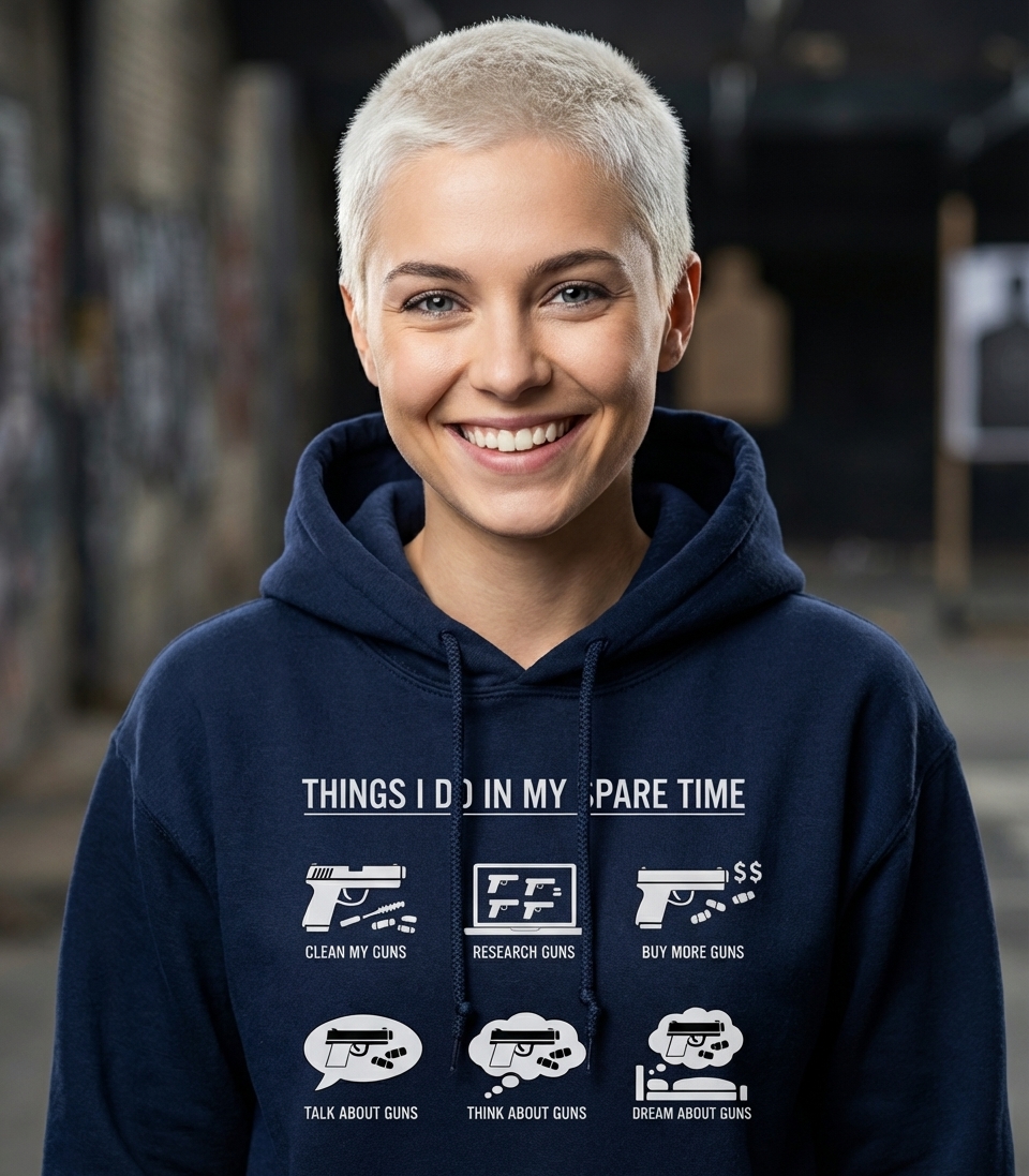 The "Things I Do In My Spare Time" graphic captures the lifestyle of passionate gun enthusiasts who spend their days cleaning, researching, and dreaming about firearms.