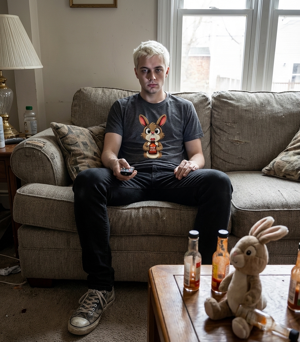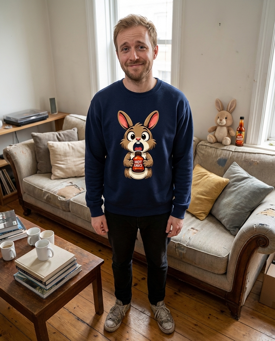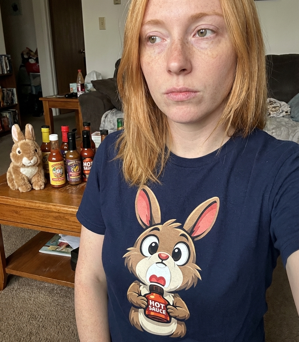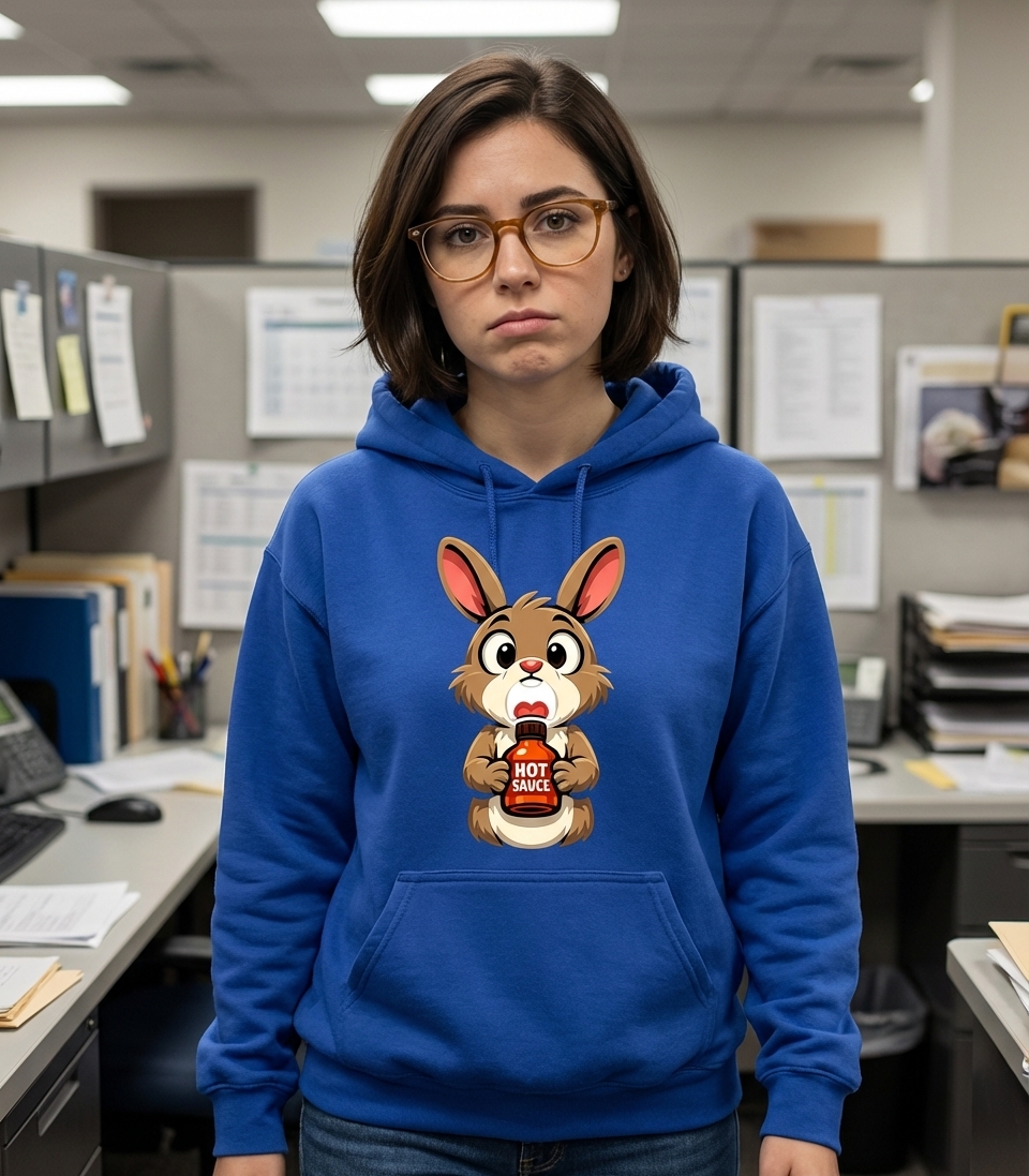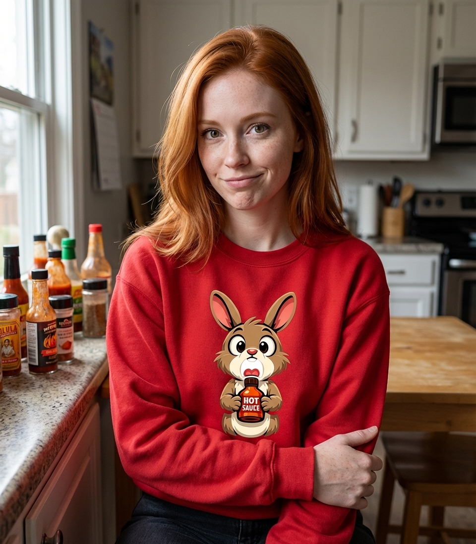The shocked bunny holding hot sauce captures the lifestyle of foodies and spice enthusiasts who enjoy trying new flavors, challenging their taste buds, and sharing funny reactions.