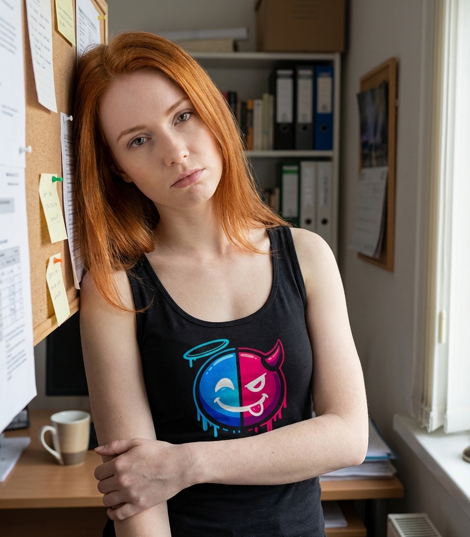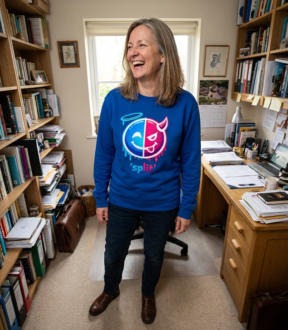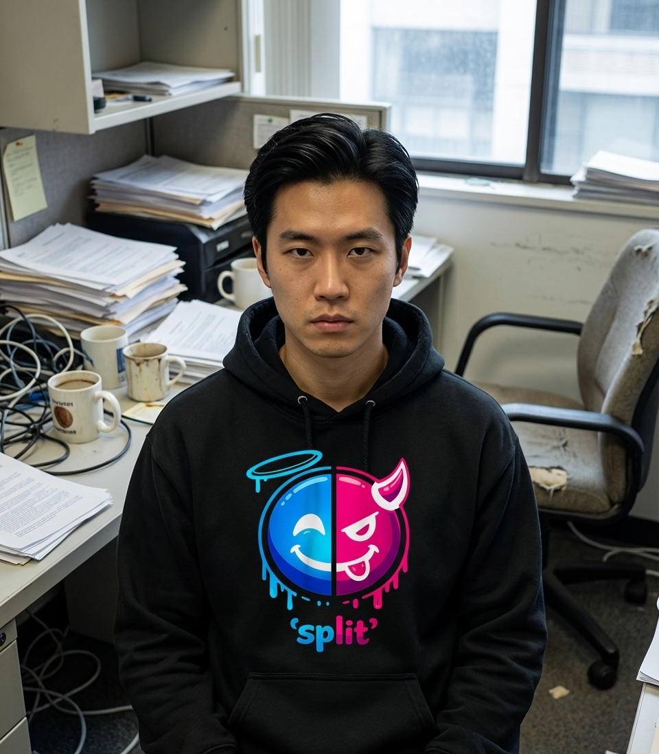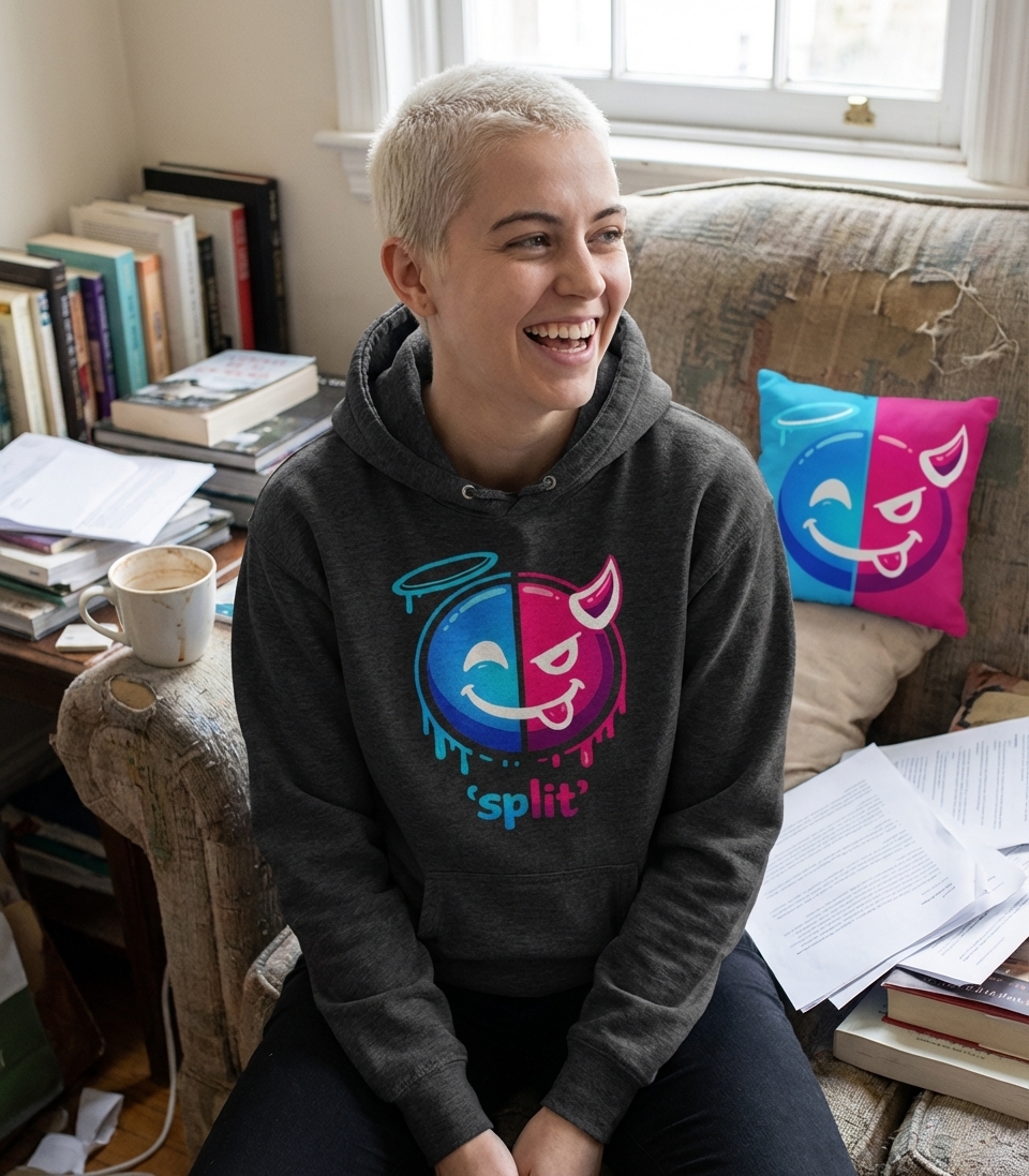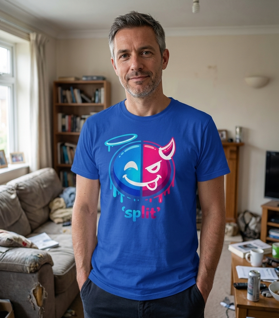 The core phrase "'split'" directly refers to the visual representation of duality within a single entity. It embodies the concept of having different, often opposing, characteristics or moods, humorously acknowledging the complexities of one's inner self.