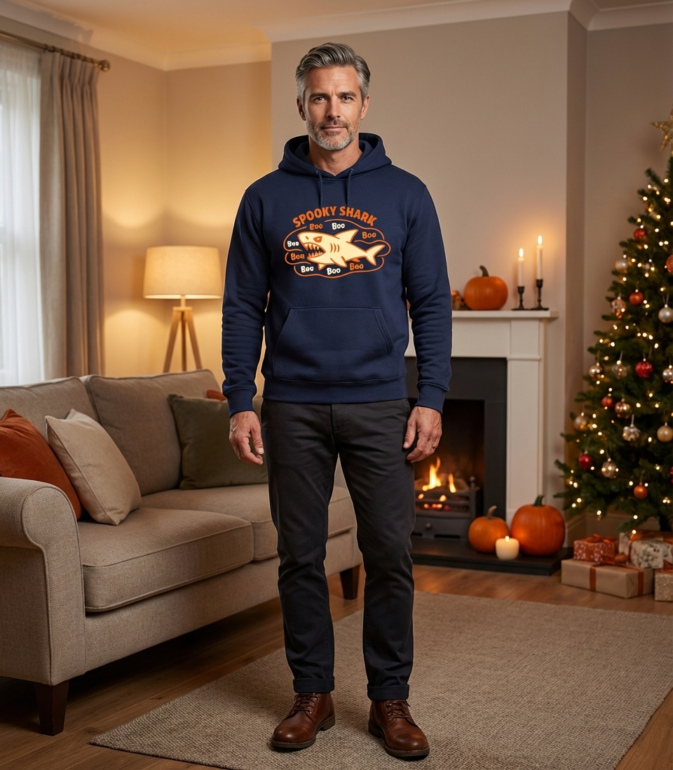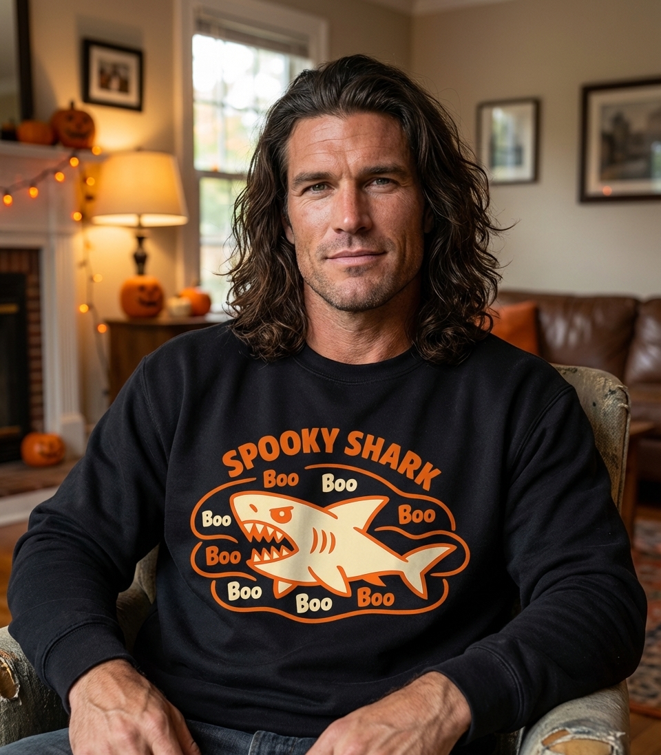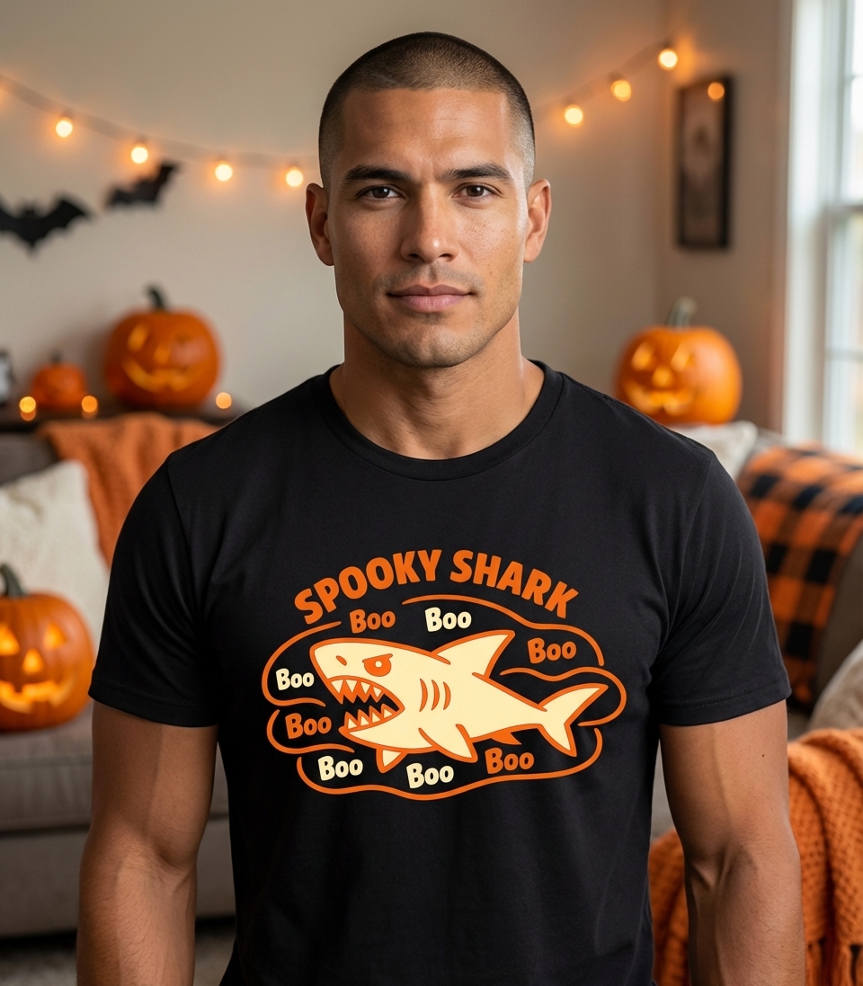 The "Spooky Shark" phrase captures the playful and slightly eerie spirit of Halloween enthusiasts who enjoy festive frights and oceanic themes.