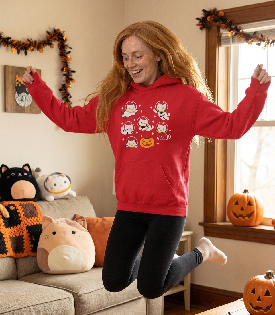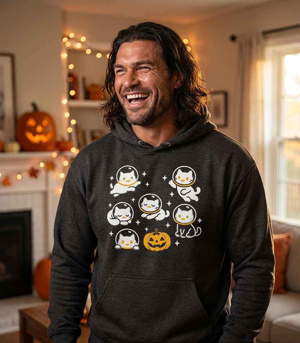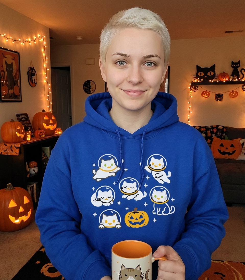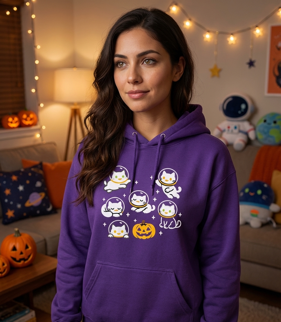 The "Spooky Space Cats" design captures the lifestyle of passionate cat lovers and Halloween fans who enjoy sci-fi themes, cute aesthetics, and celebrating the spooky season.