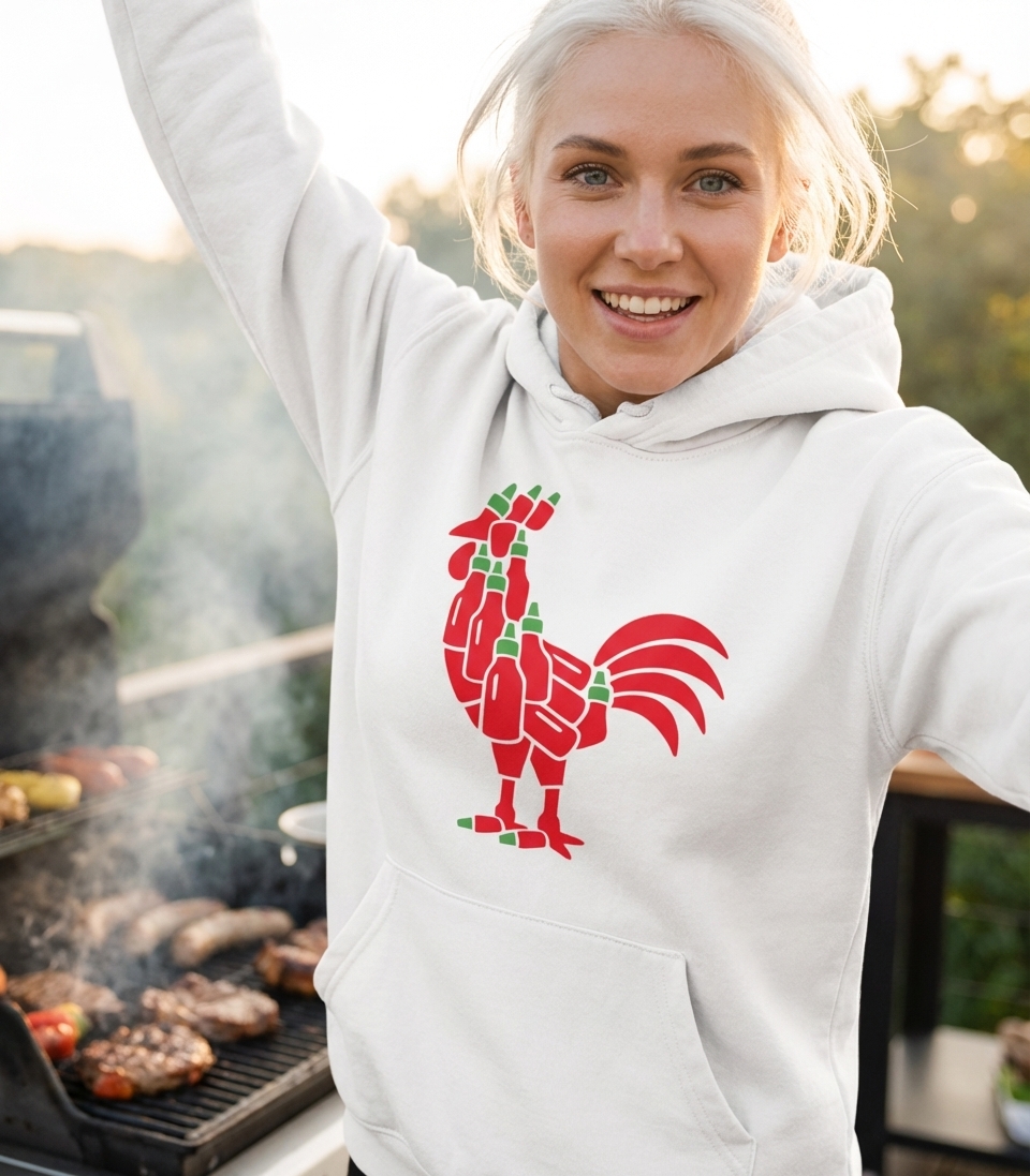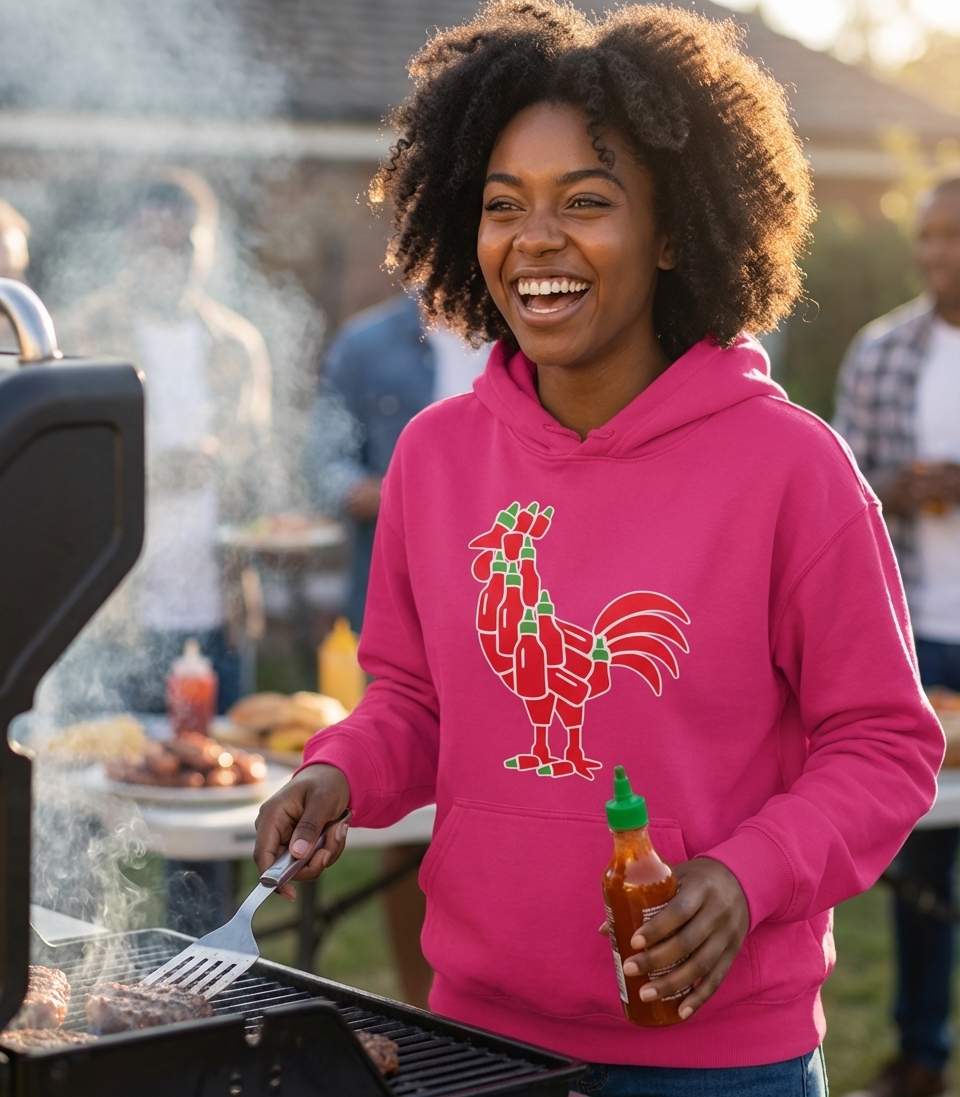 The "Sriracha Rooster" is an informal yet widely recognized reference to the iconic logo of a popular brand of hot chili sauce. This design celebrates the cultural impact and fiery flavor of this staple condiment in kitchens worldwide.