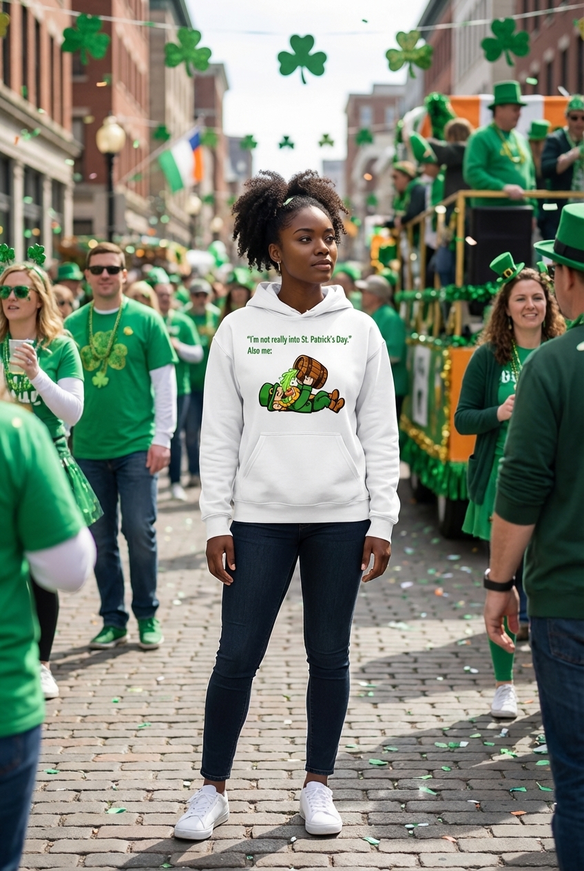 The 'I'm not really into St. Patrick's Day' phrase captures the lifestyle of festive celebrators who embrace the green holiday with spirited drinking, cheerful gatherings, and a touch of humorous contradiction.