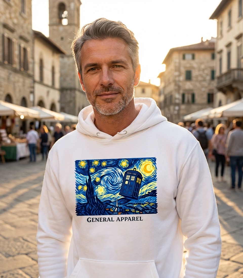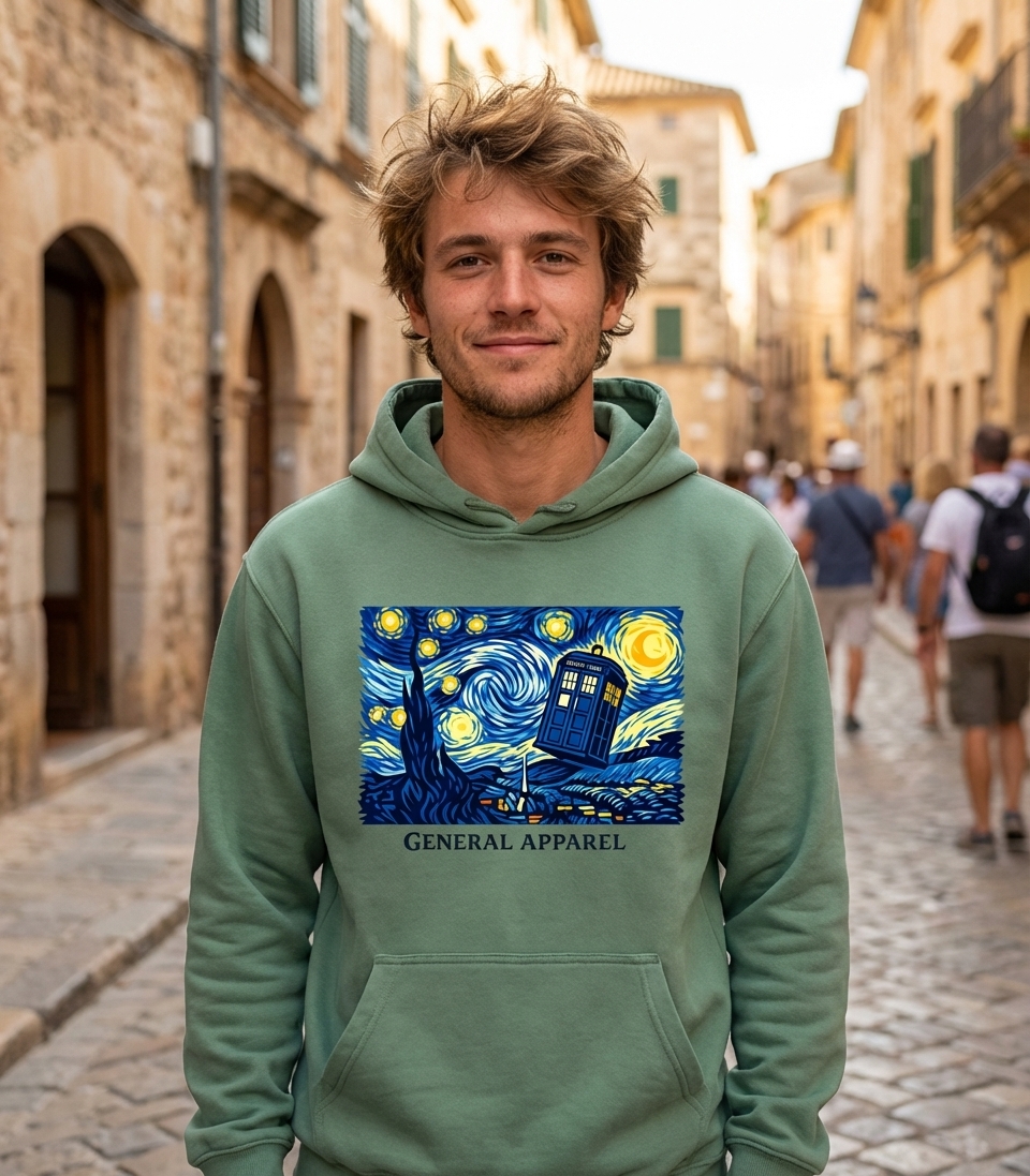 This unique graphic artwork merges two cultural icons: Vincent van Gogh's masterpiece 'The Starry Night' and the legendary TARDIS from Doctor Who. It presents a fantastical scene where the familiar blue police box floats amidst Van Gogh's swirling, vibrant sky, creating a whimsical and thought-provoking visual.