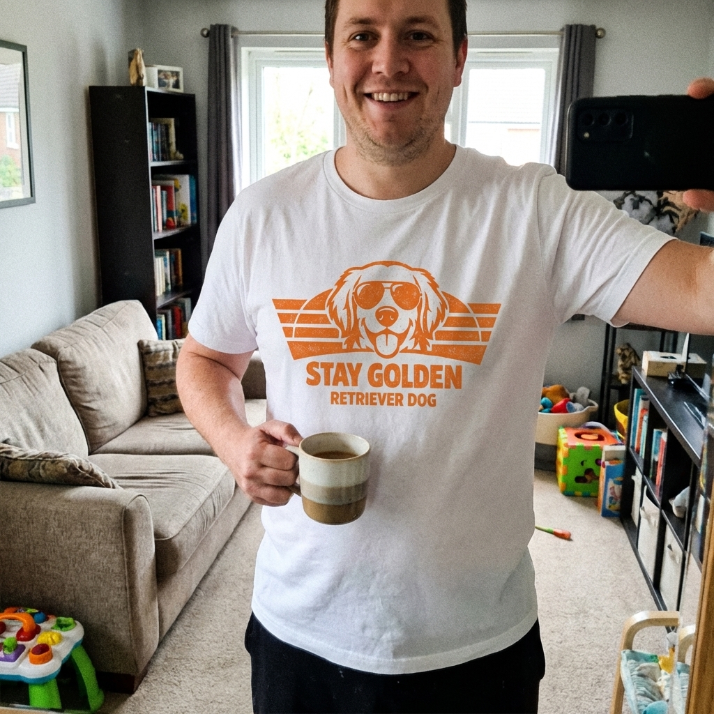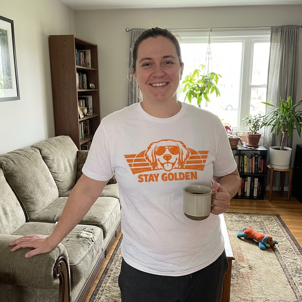 Okay, just got this shirt and wow, it's so cute! The golden retriever design is really unique and totally fits my vibe. Super comfy too, I can tell this is gonna be a favorite.