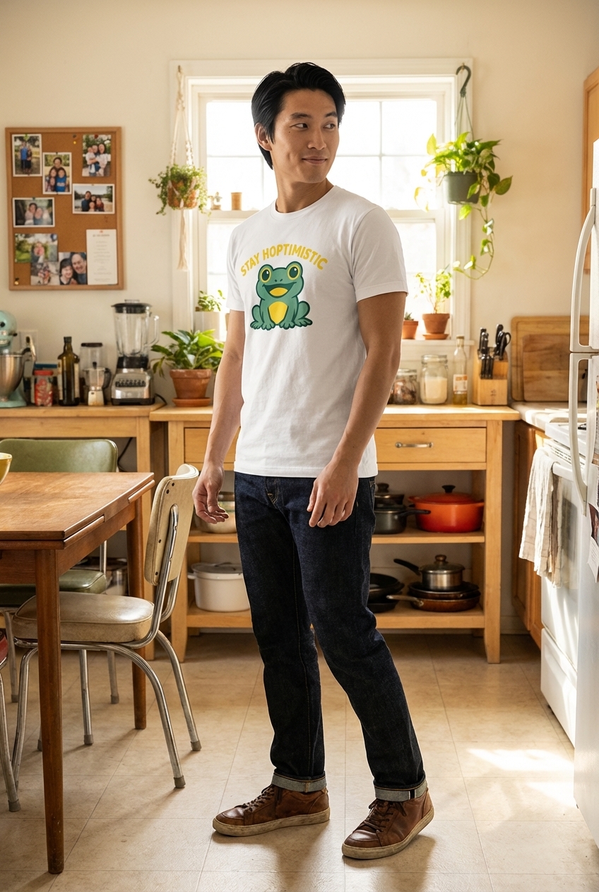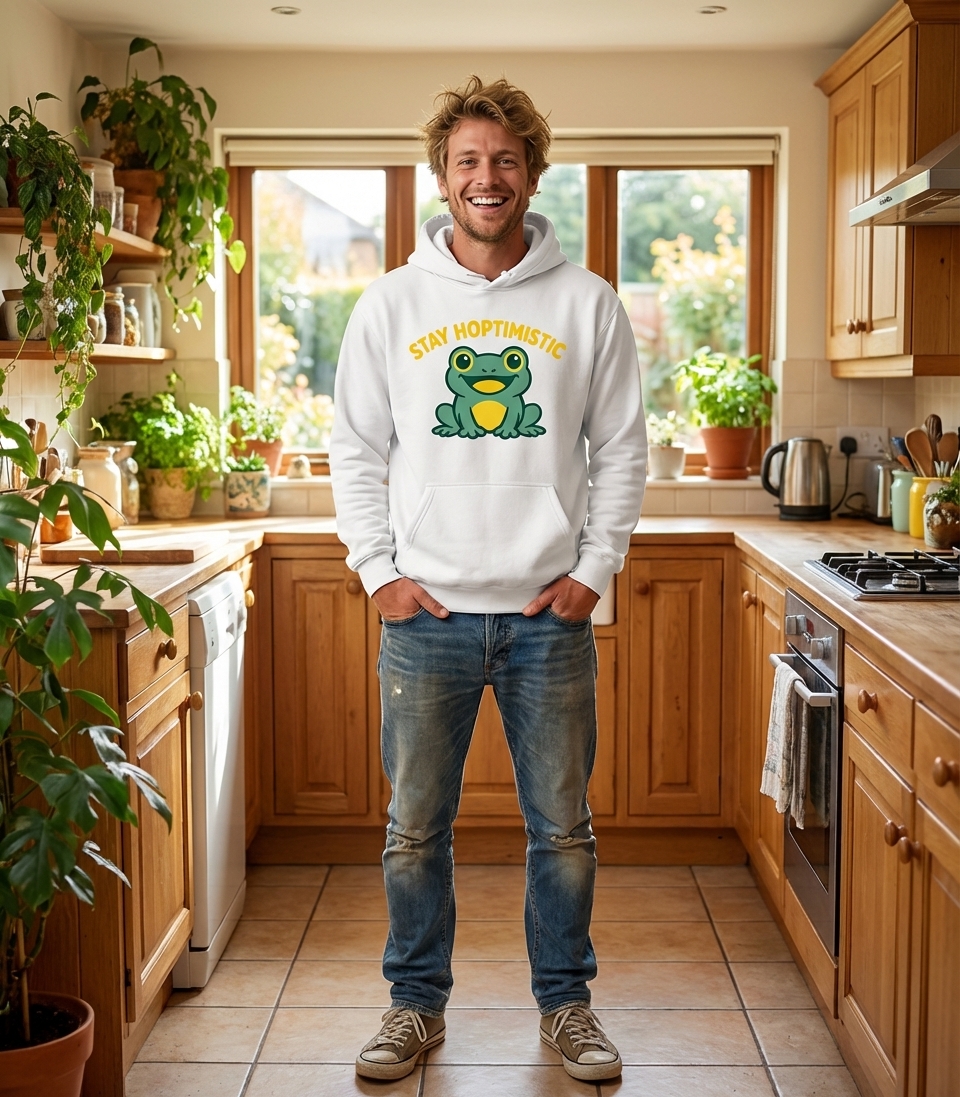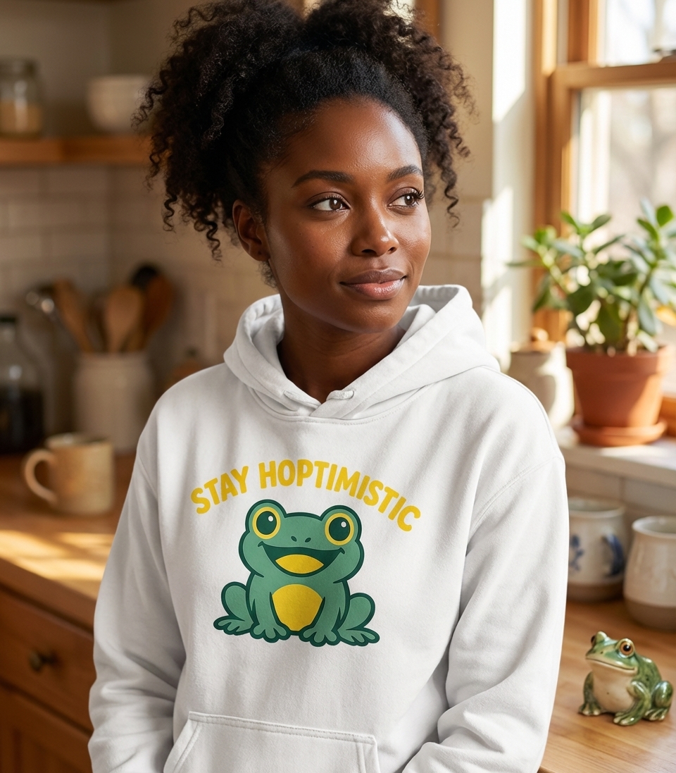 The "Stay Hoptimistic" phrase captures the lifestyle of cheerful frog enthusiasts who love positive vibes, clever wordplay, and spreading smiles.