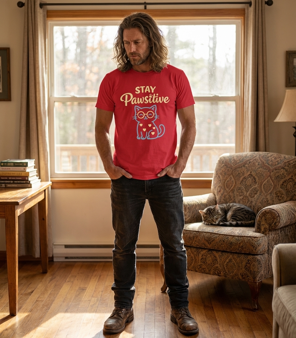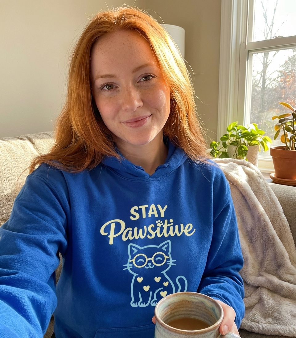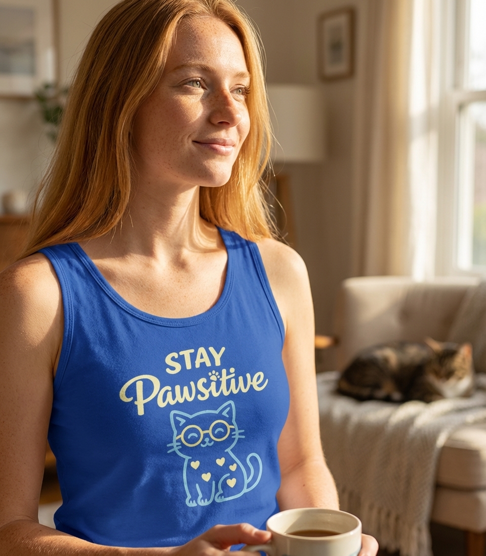 The 'Stay Pawsitive' phrase captures the lifestyle of optimistic cat lovers who spread cheer, embrace wordplay, and enjoy cute feline graphics.