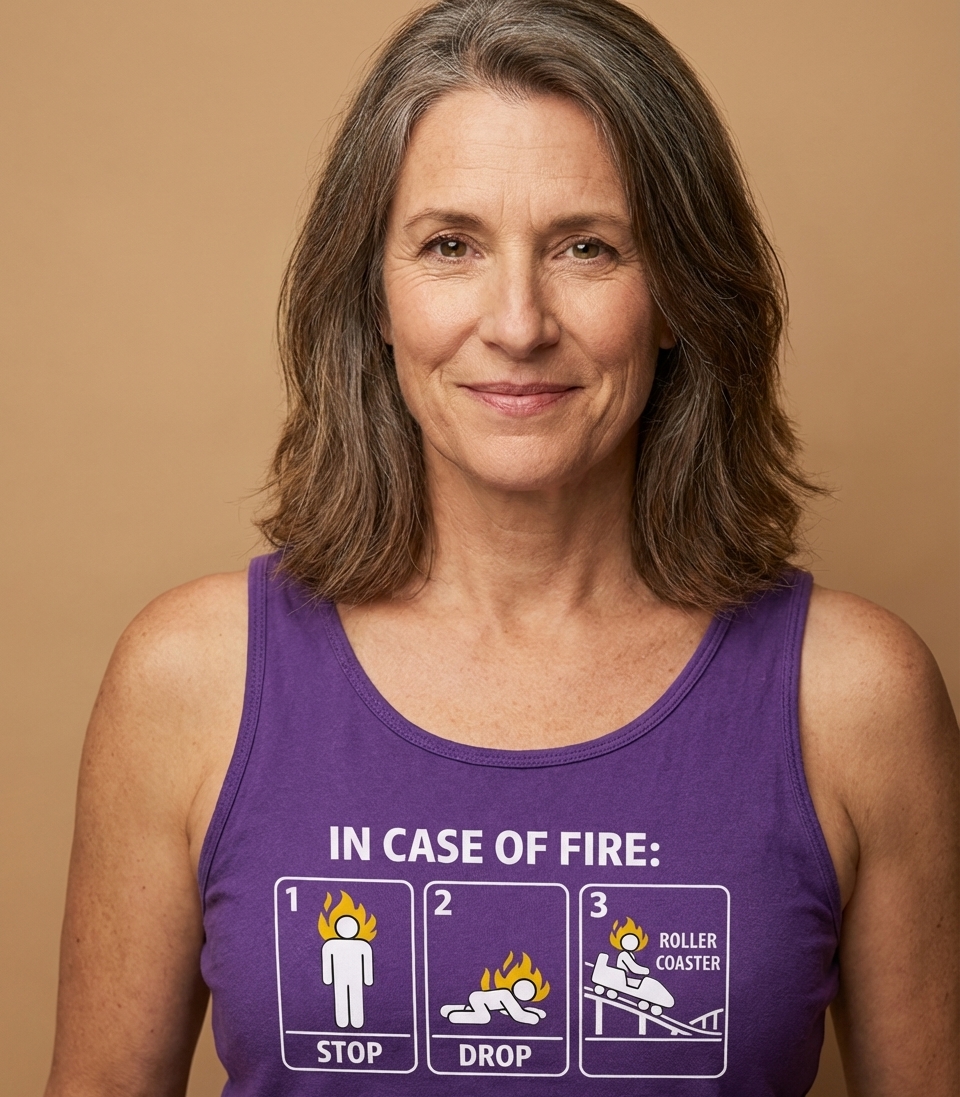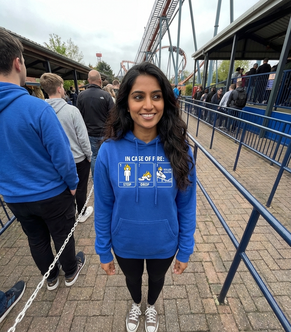 The phrase "In Case of Fire: Stop, Drop, Roller Coaster" is a witty parody of a common emergency procedure. It replaces the final, practical step of "rolling" to extinguish flames with the playful suggestion of riding a roller coaster.