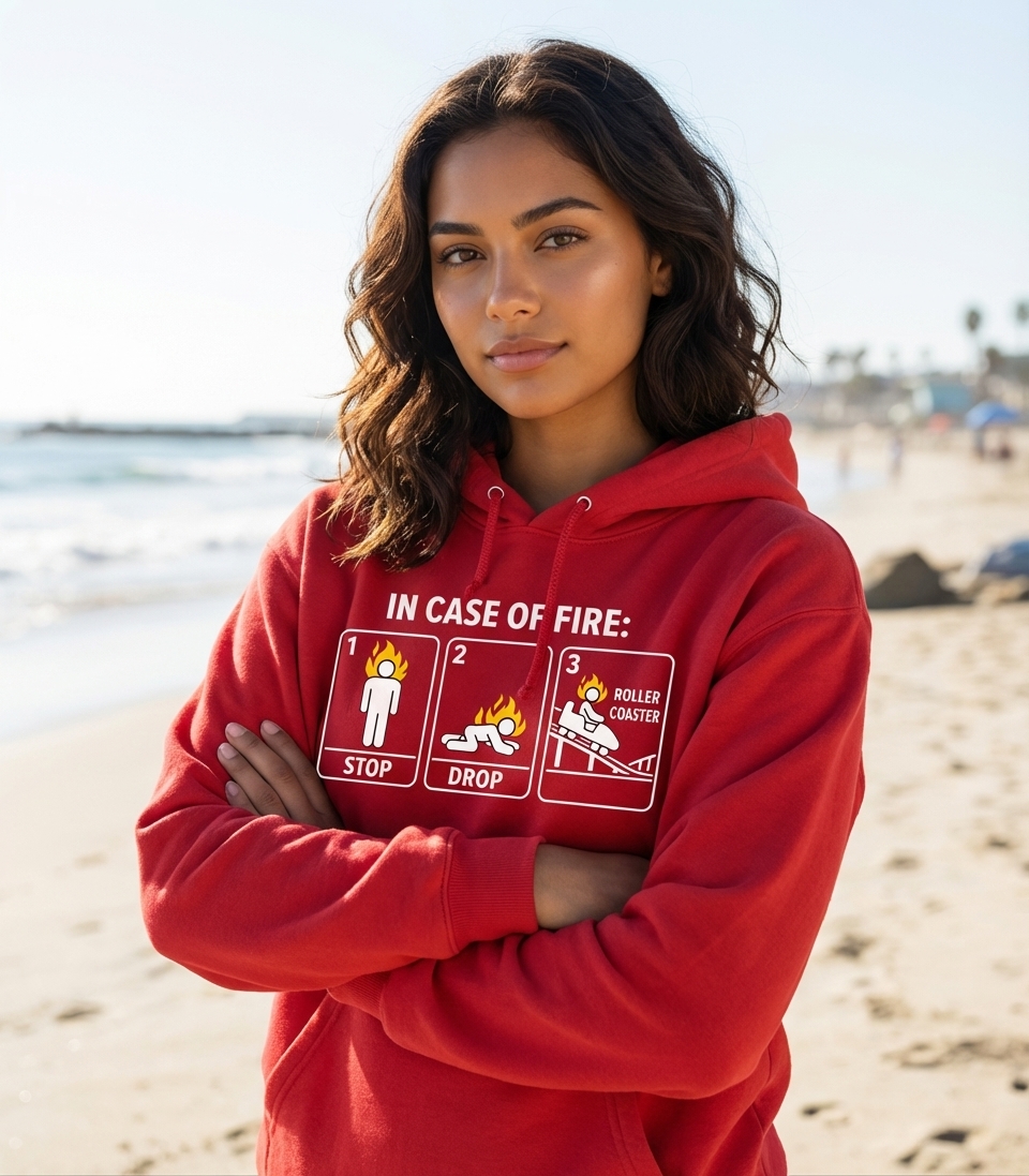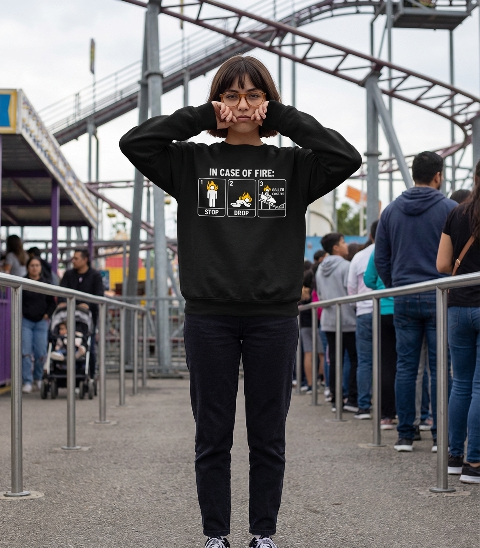 This design cleverly twists the well-known "Stop, Drop, and Roll" fire safety advice into a humorous directive for thrill-seekers. It presents a three-panel comic strip, leading a person on fire from standing to dropping, then enthusiastically boarding a roller coaster.