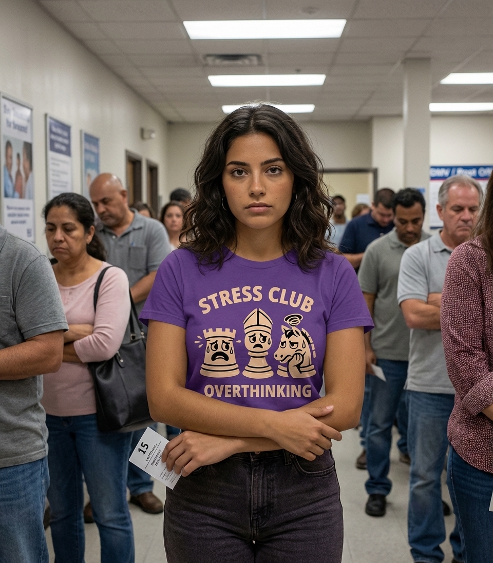 The 'Stress Club' phrase captures the relatable experience of individuals who navigate daily challenges by confidently overthinking every scenario.