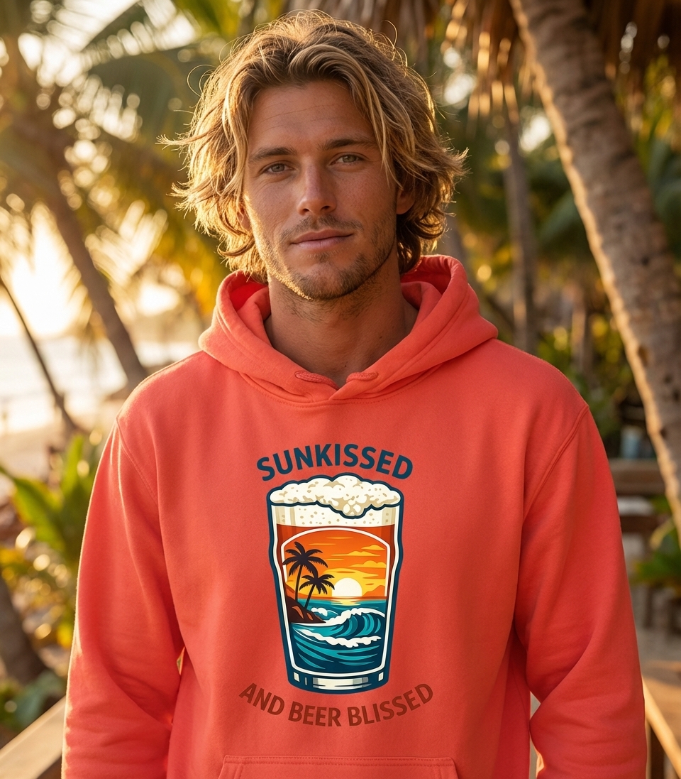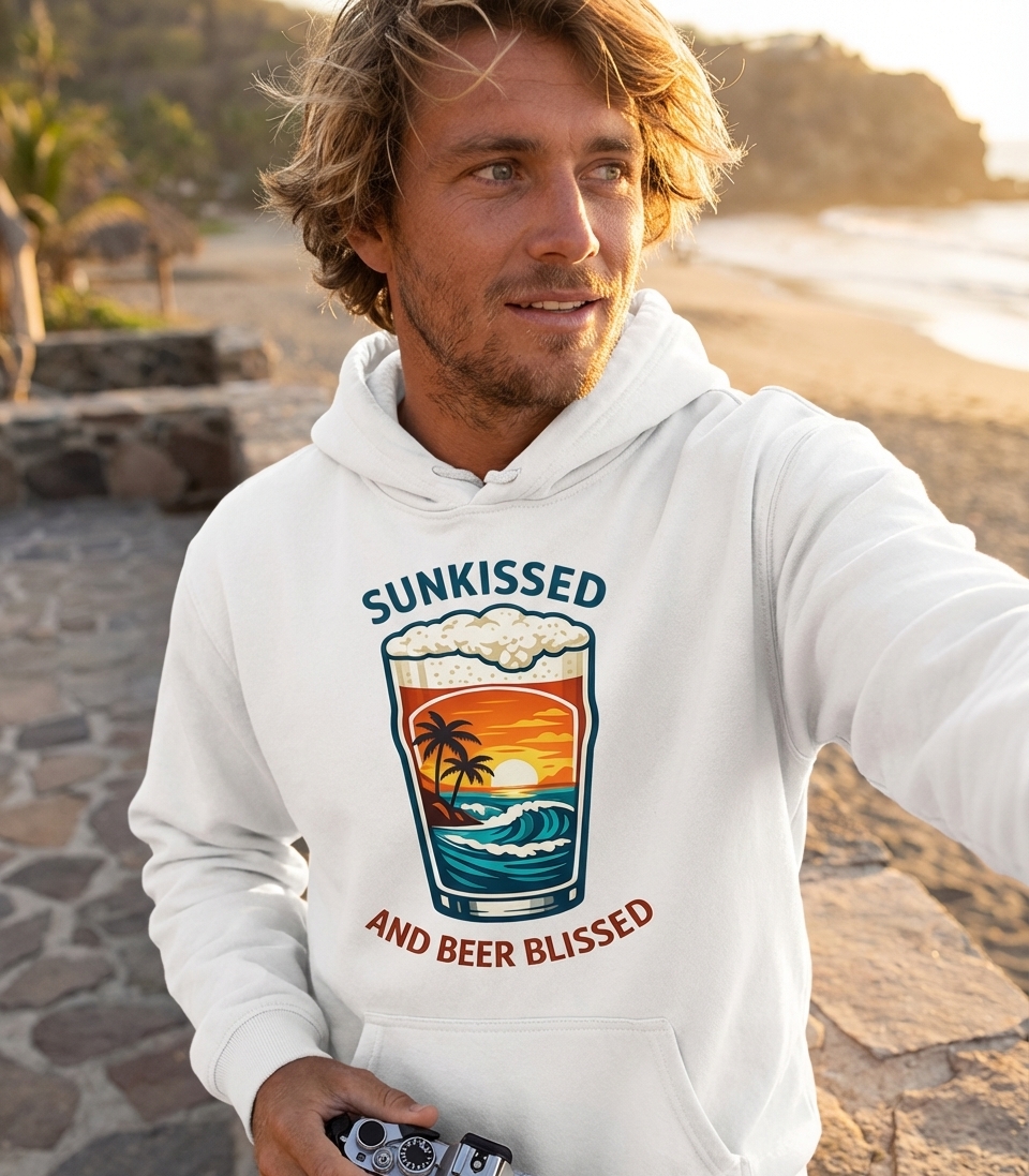 The 'Sunkissed And Beer Blissed' phrase captures the lifestyle of passionate vacationers who spend their days soaking up the sun, enjoying ocean breezes, and savoring refreshing brews.