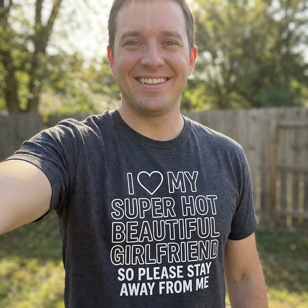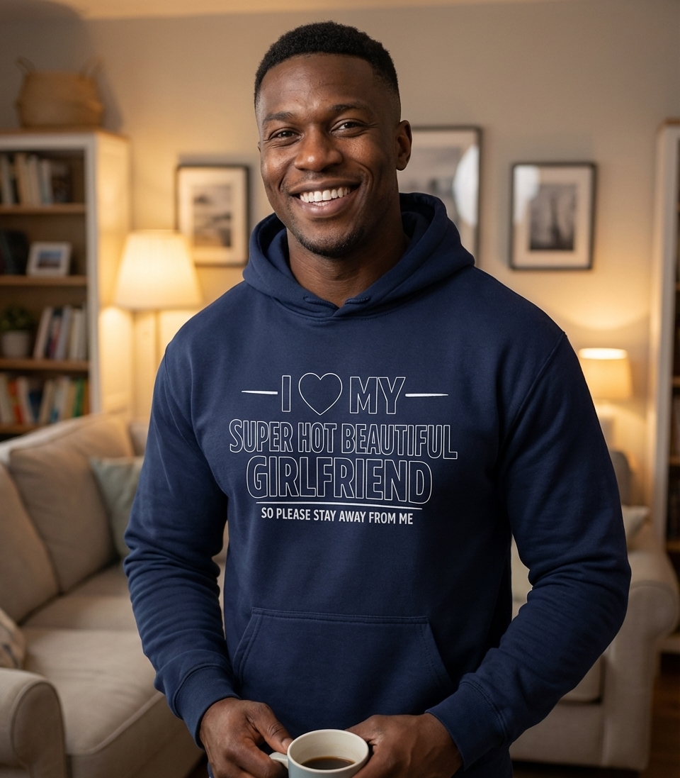The "I Love My Super Hot Girlfriend" phrase captures the protective and humorous spirit of boyfriends who want to playfully warn others to admire from a distance.
