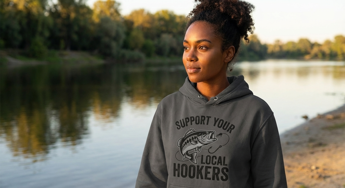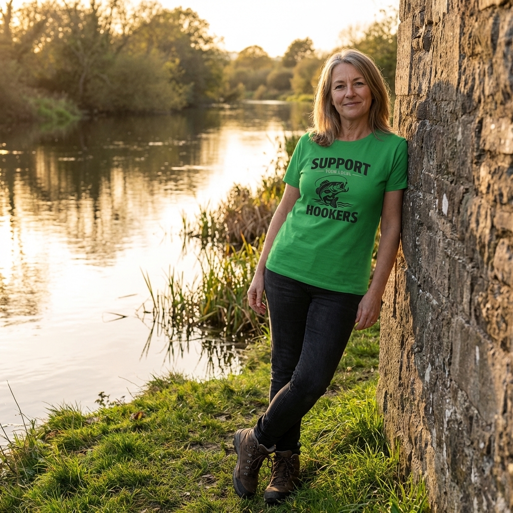 The "Support Your Local Hookers" phrase captures the lifestyle of passionate anglers who spend their days casting lines, reeling in catches, and enjoying the water.