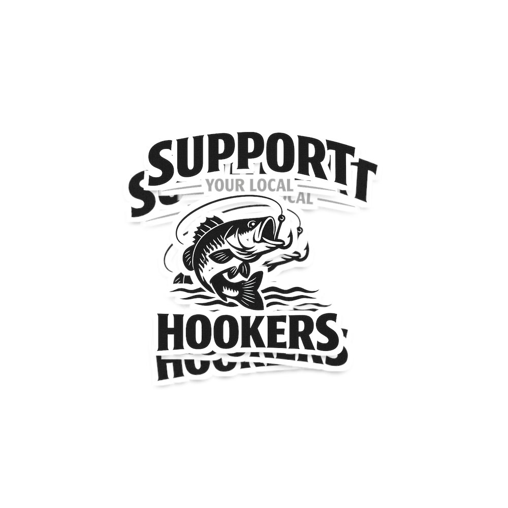 The phrase "Support Your Local Hookers" is a playful double entendre that appeals directly to the fishing community. It uses "hookers" in the context of fishing – referring to those who use hooks to catch fish – to create an unexpected and humorous twist, celebrating the sport with a wink. It's a classic example of fishing humor.