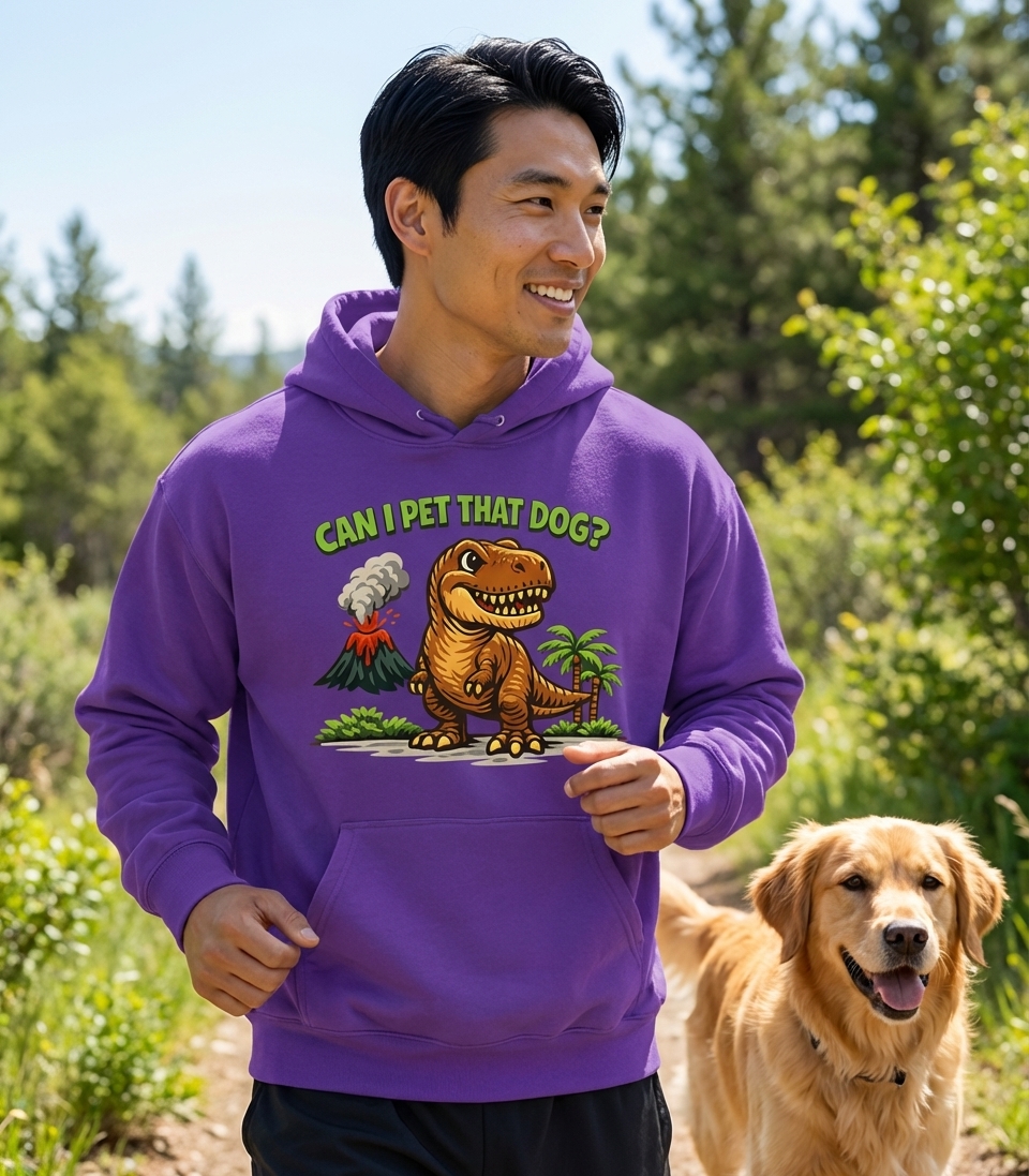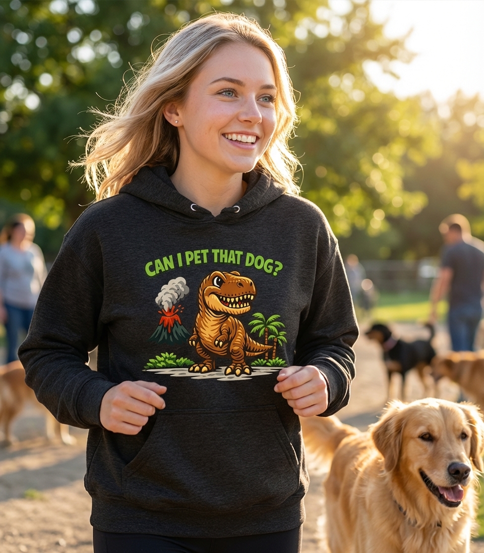 This design captures the lighthearted spirit of dinosaur enthusiasts and dog lovers who appreciate a good laugh and dream of a world where all creatures can be friends.