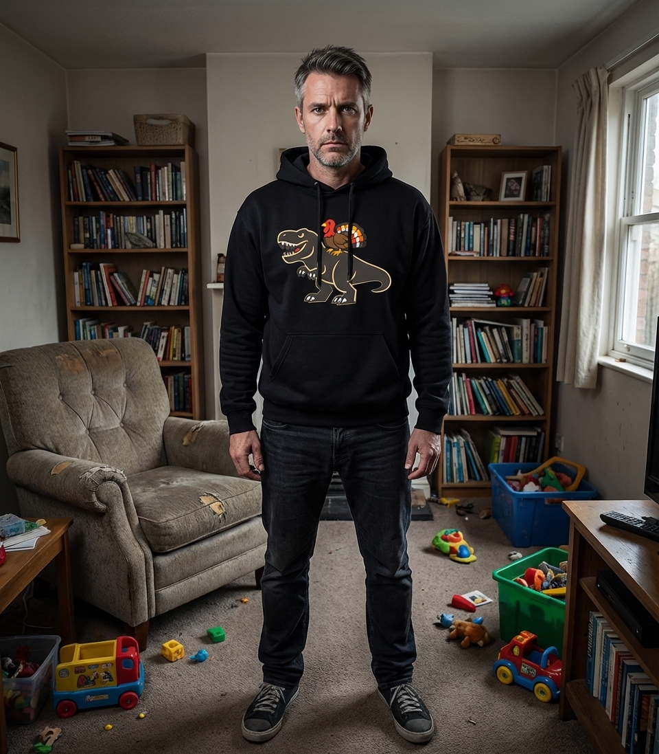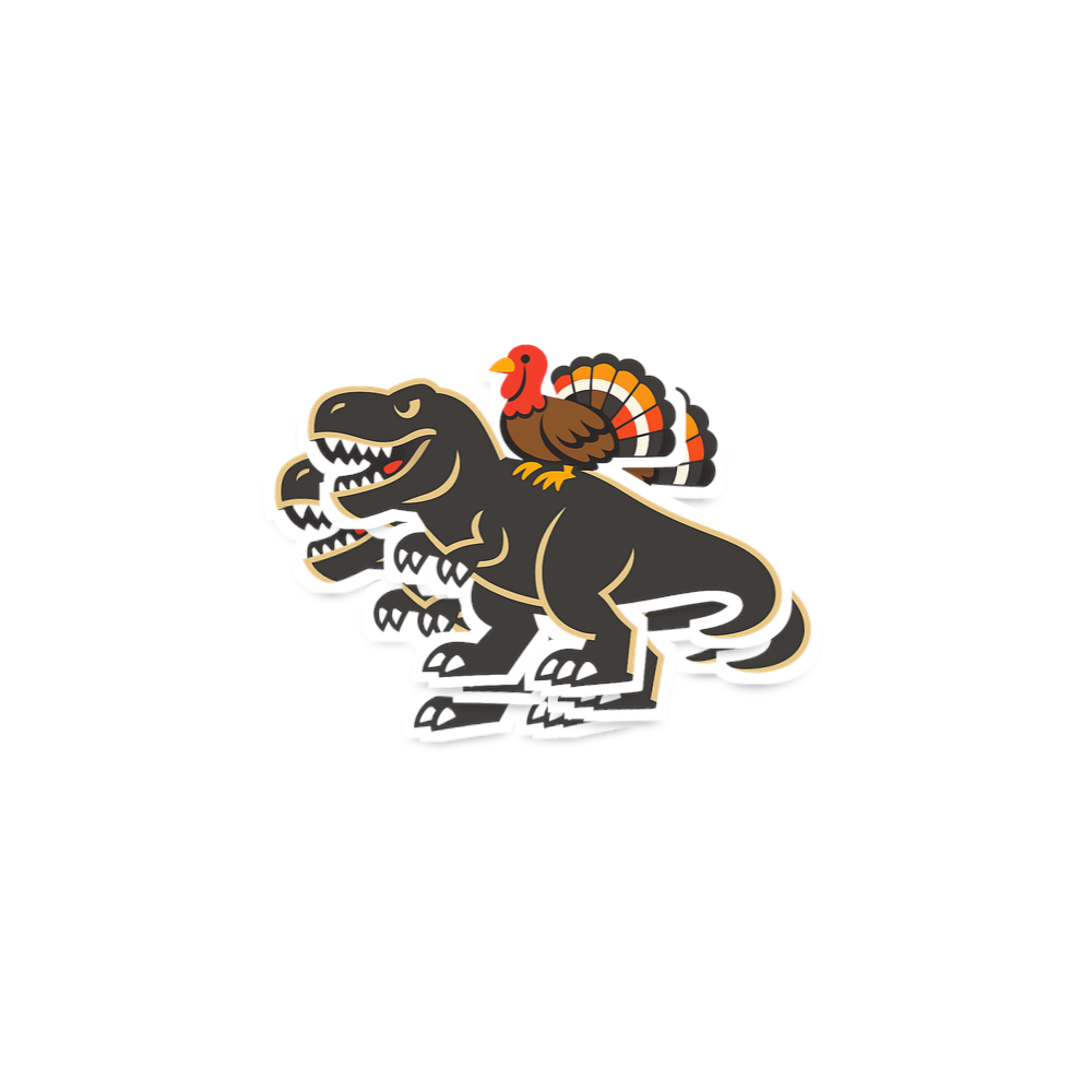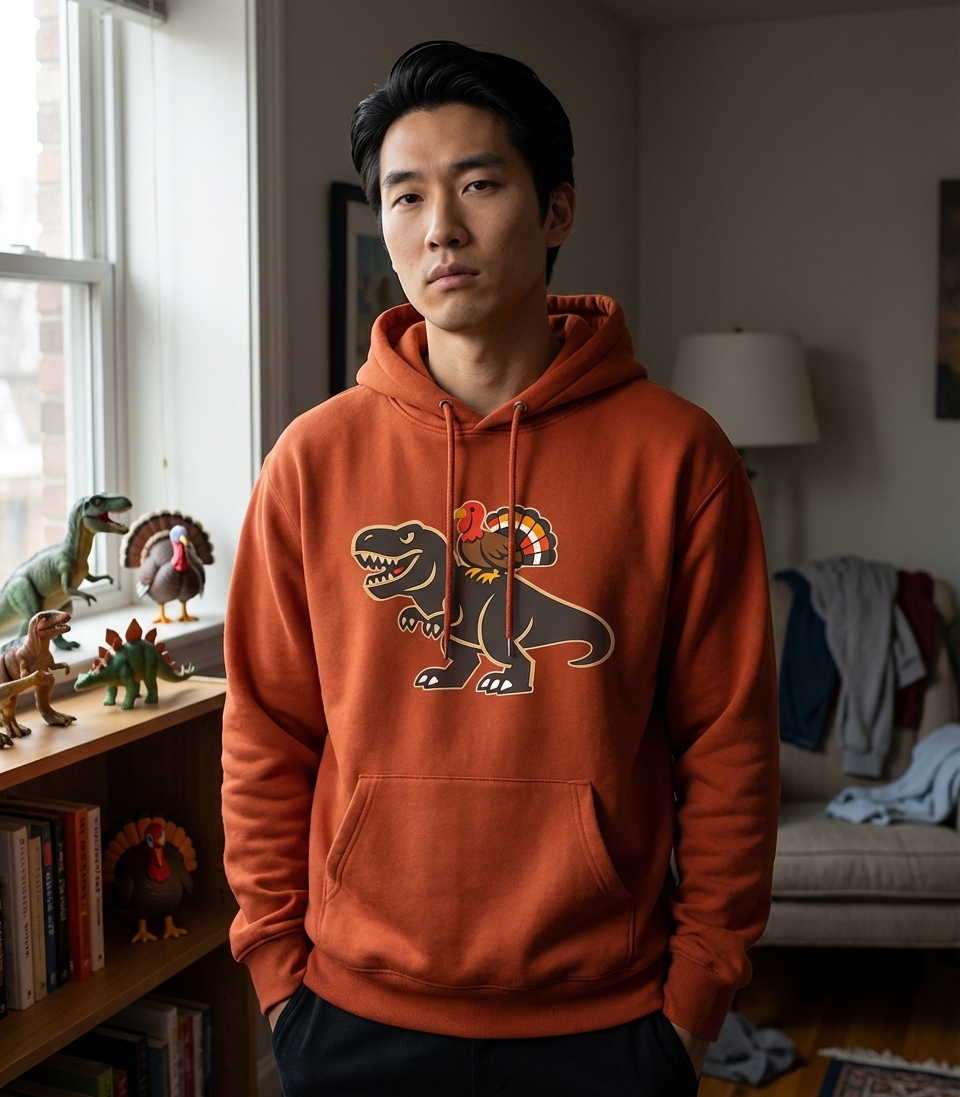 This charming design features a cheerful T-Rex carrying an equally happy turkey on its back. The illustration combines two unlikely companions in a whimsical scene, making for a truly unique and conversation-starting piece of apparel.