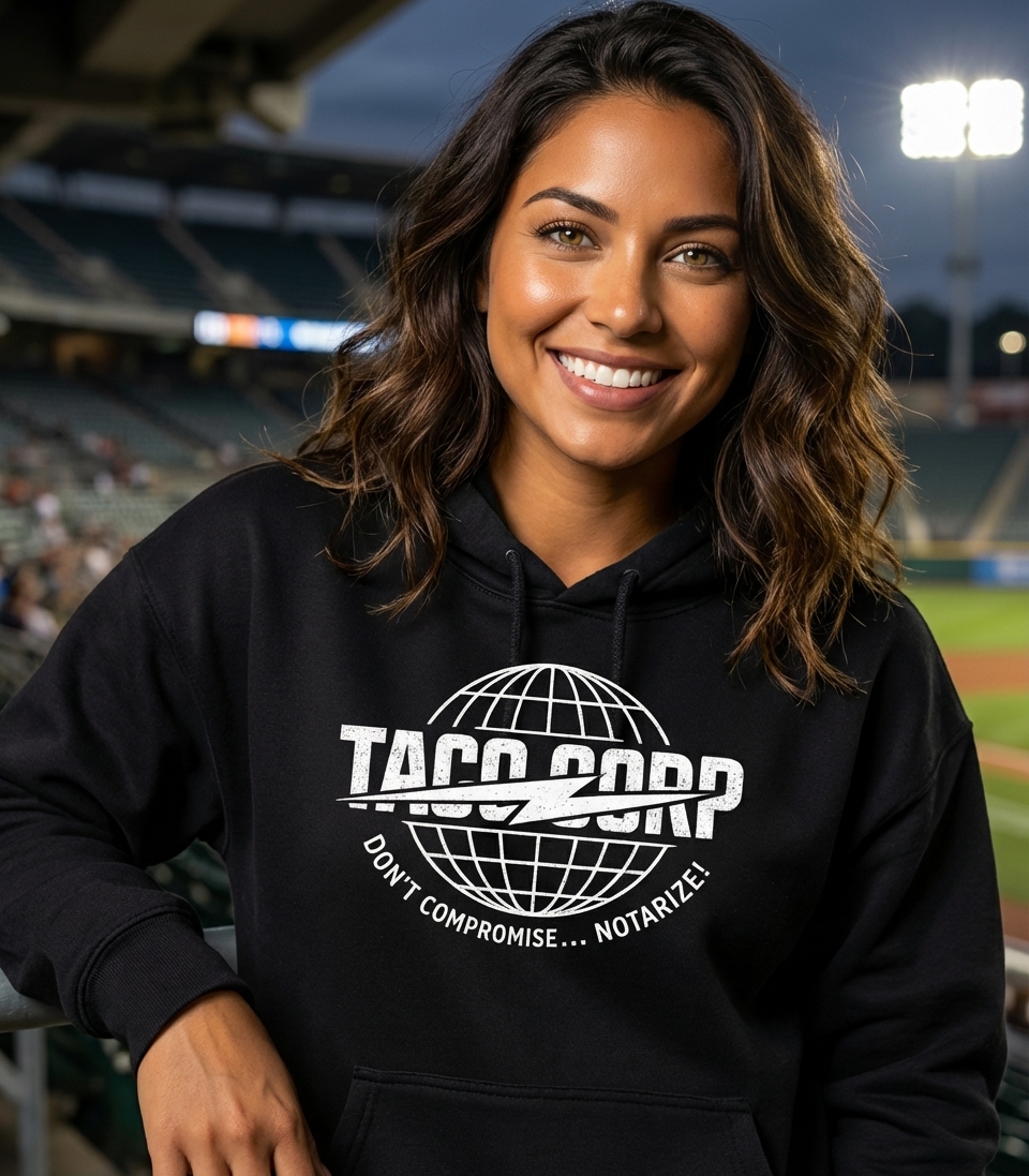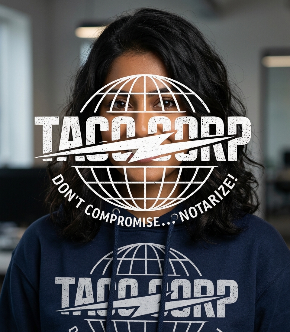 "Taco Corp" playfully merges the popular food item with the serious connotation of a global corporation, creating an absurd and memorable entity. The accompanying motto, "Don't Compromise... Notarize!", cleverly twists traditional business or legal advice into a humorous directive, emphasizing official verification over negotiation in a whimsical context.