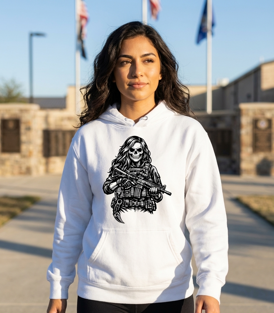 This artwork presents a stark black and white graphic of a skull adorned with long, flowing hair, signifying a relentless warrior. The figure is fully equipped with tactical gear, including an assault rifle with a scope and a distinctive karambit knife on the hip, emphasizing readiness and combat prowess.