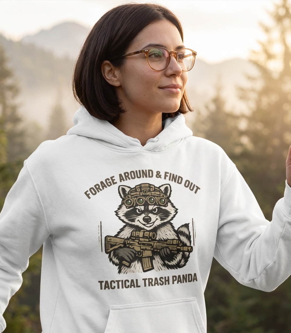 The design prominently displays the phrases "Forage Around & Find Out" and "Tactical Trash Panda." "Forage Around & Find Out" is a clever, humorous twist on a well-known idiom, suggesting a mischievous yet confident stance. "Tactical Trash Panda" is a popular, endearing term for raccoons, highlighting their resourceful and somewhat sneaky nature in a military-inspired context.