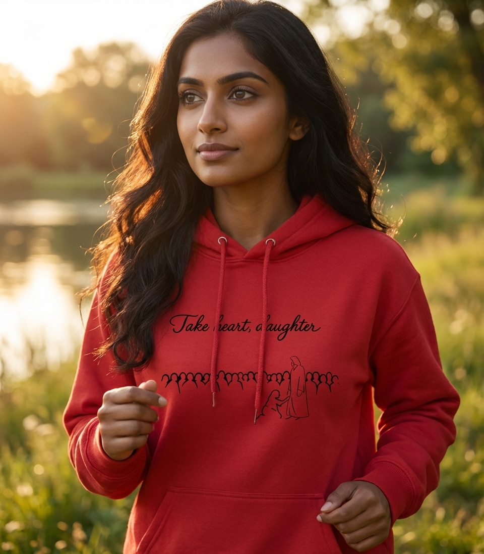 The phrase "Take heart, daughter" is a direct biblical quote, notably from Matthew 9:22, where Jesus speaks to the woman with the issue of blood. It signifies reassurance, courage, and divine compassion. It's a message of hope, encouraging individuals to have faith and find inner peace amidst challenges.