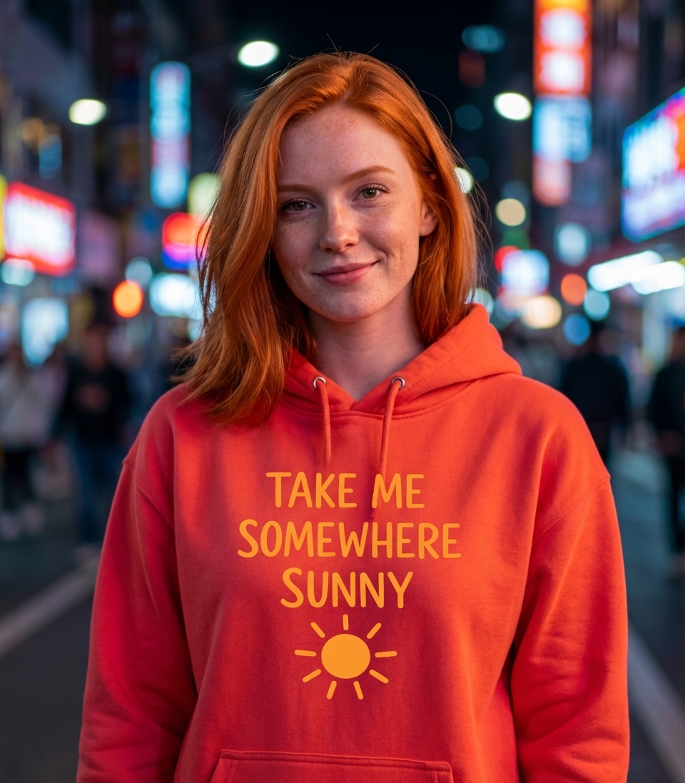 The 'Take Me Somewhere Sunny' phrase captures the lifestyle of those who yearn for warmth, relaxation, and bright, sunny days.