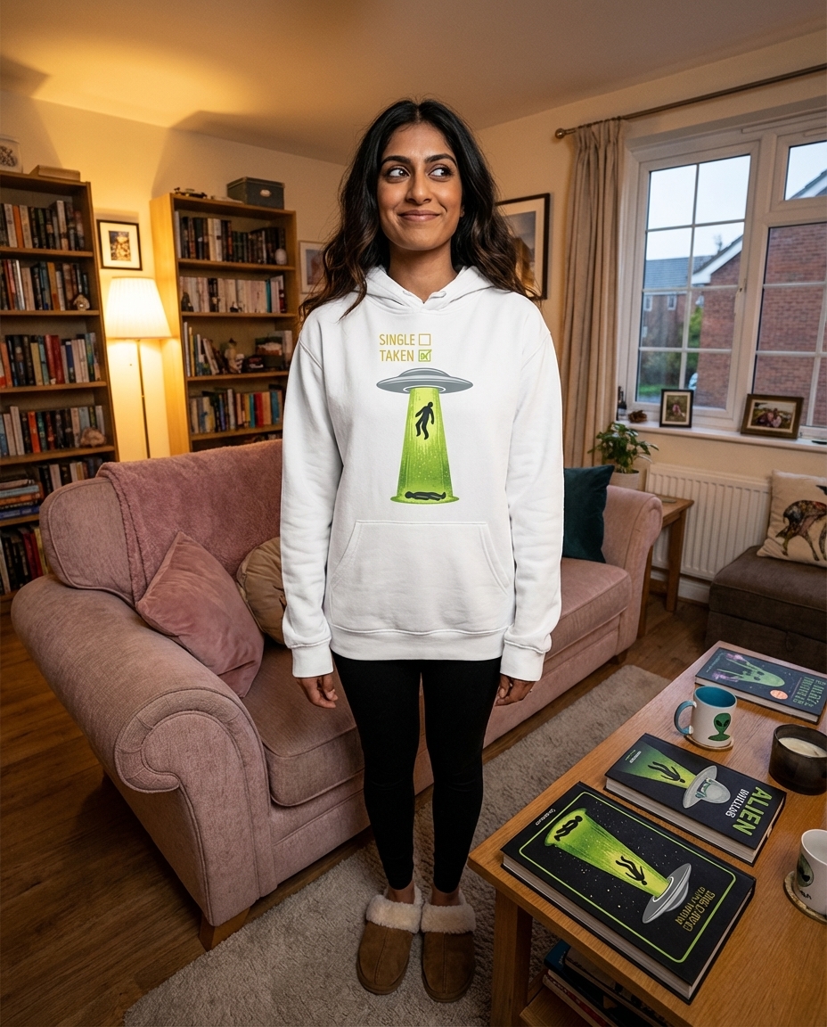 The core humor of this design lies in the playful double meaning of the word 'taken.' Instead of the conventional romantic sense of being in a relationship, the checked box implies being 'taken' by extraterrestrial beings. It’s a witty commentary on modern dating statuses with an alien twist.